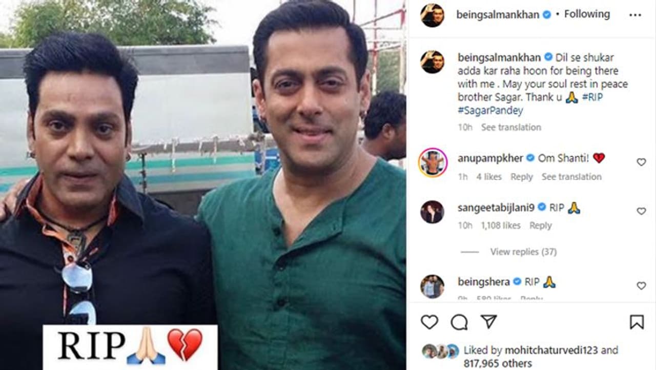 सलमान ने सोशल मीडिया पर पांडे के साथ अपनी एक तस्वीर साझा की है, जिसमें टूटे हुए दिल और हाथ जोड़ने वाली इमोजी के साथ RIP (आत्मा को शांति मिले) लिखा है। फोटो फिल्म 'बजरंगी भाईजान' के सेट की जान पड़ती है, जिसमें सलमान पांडे के कंधे पर हाथ रखे दिखाई दे रहे हैं। इसे कैप्शन देते हुए सलमान ने अपनी भावुक पोस्ट में लिखा है, "मेरे साथ बने रहने के लिए दिल से शुक्र अदा कर रहा हूं। भाई सागर आपकी आत्मा को शांति मिले। शुक्रिया।"