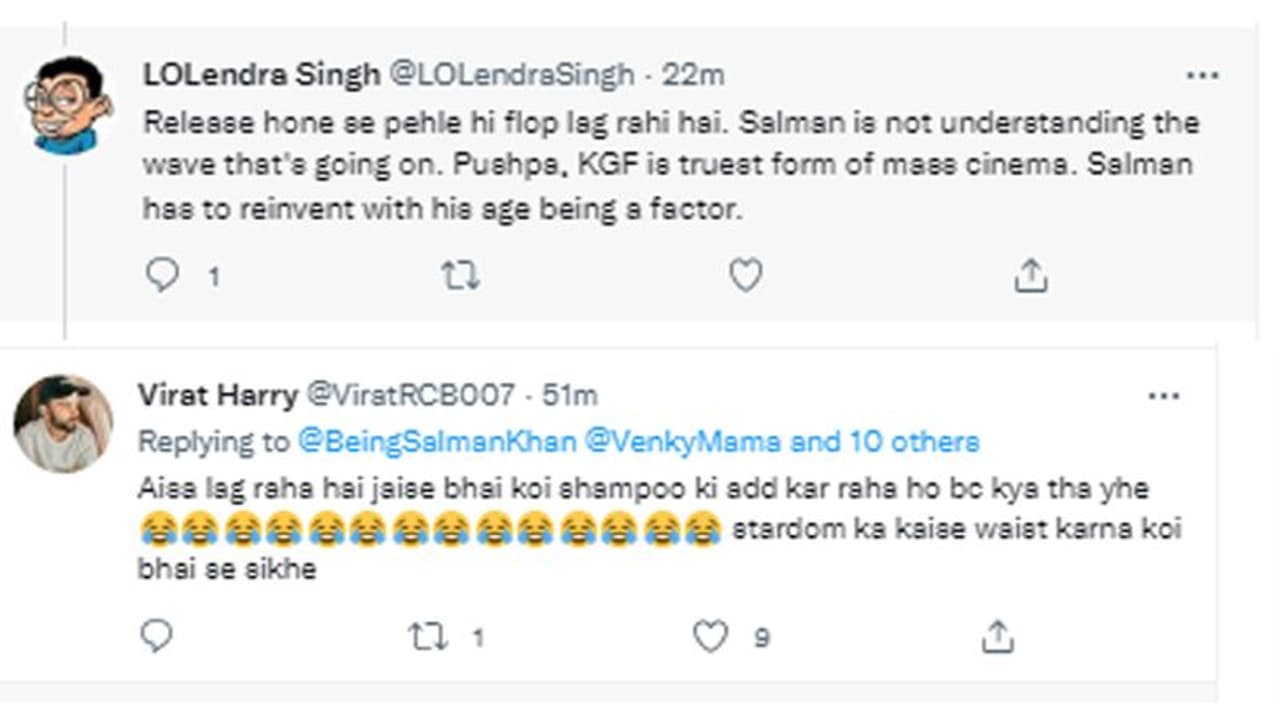 एक यूजर ने लिखा है, "रिलीज होने से पहले ही फ्लॉप लग रही है। सलमान उस लहर को नहीं समझ रहे हैं, जो फिलहाल चल रही है। 'KGF' मास सिनेमा का सच्चा रूप है। एक एक्टर के तौर पर अपनी उम्र के हिसाब से काम करना चाहिए।" एक यूजर का कमेंट है, "ऐसा लग रहा है जैसे भाई कोई शैम्पू की ऐड कर रहा हो। वो क्या था ये? स्टारडम को कैसे बर्बाद करना है, कोई भाई से सीखे।"