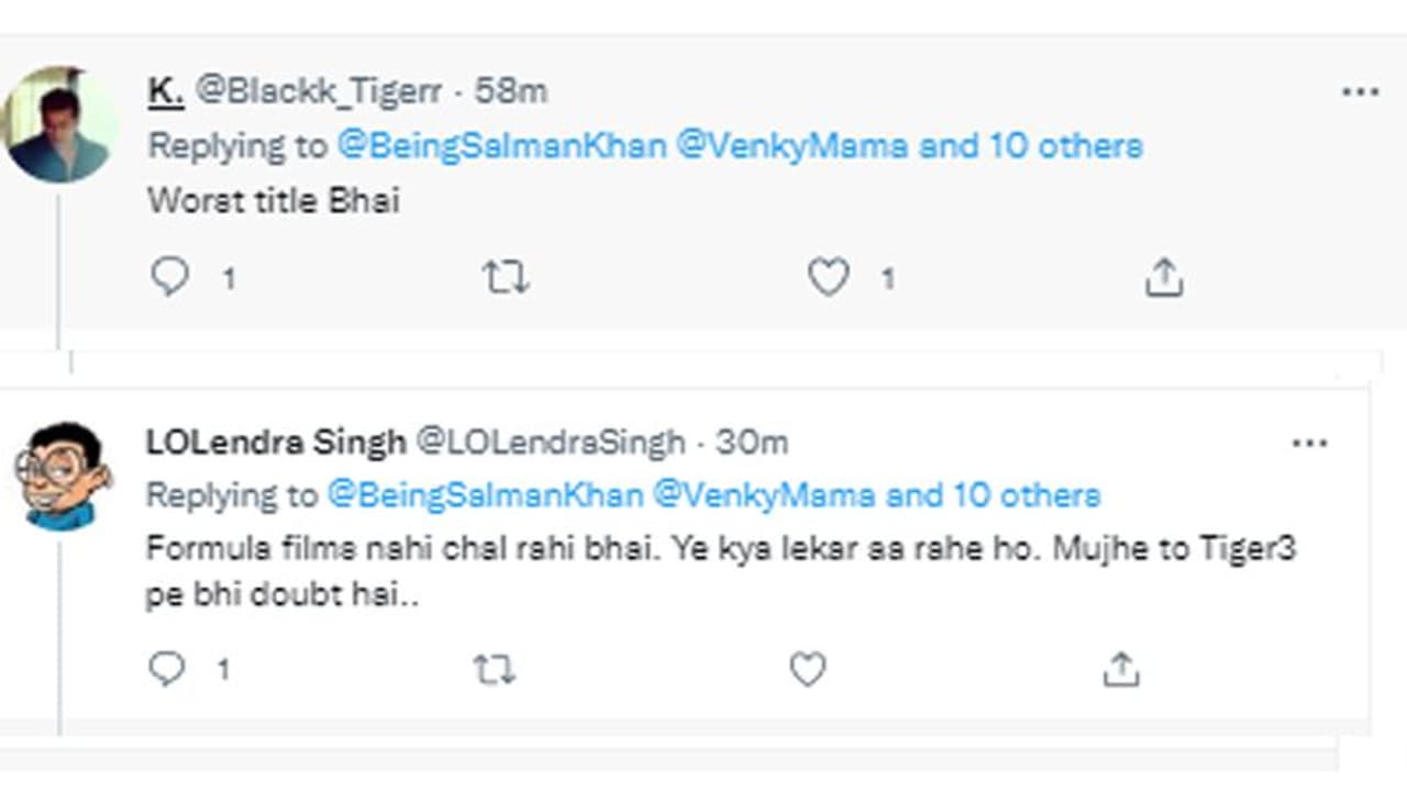 एक यूजर ने लिखा है, "वर्स्ट टाइटल भाई।" एक यूजर ने फिल्म की थीम पर कमेंट किया है और लिखा है, "फ़ॉर्मूला फिल्म नहीं चल रही भाई। ये कक्या लेकर आ रहे हो। मुझे तो 'टाइगर 3' पर भी डाउट है।"
