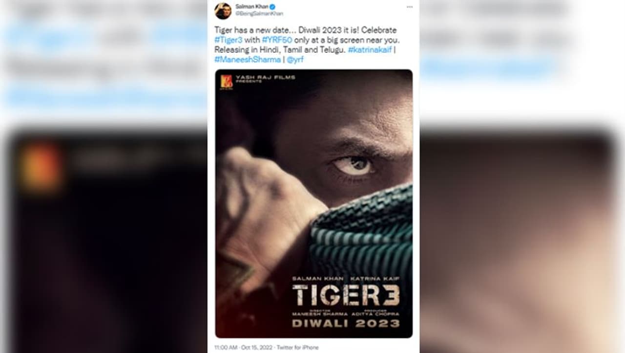 एंटरटेनमेंट डेस्क. सलमान खान (Salman Khan) और कटरीना कैफ (Katrina Kaif) स्टारर अपकमिंग फिल्म 'टाइगर 3' (Tiger 3) की रिलीज डेट आगे बढ़ बढ़ गई है। अब यह फिल्म ईद पर ना आकर अगले साल दिवाली पर रिलीज होगी। खुद सलमान खान ने सोशल मीडिया के माध्यम से इस बात का एलान किया है। उन्होंने फिल्म का नया पोस्टर साझा करते हुए लिखा है, "टाइगर 3 की नई तारीख। दिवाली 2023। YRF50 के साथ टाइगर 3 को सेलिब्रेट करें अपने नजदीकी सिनेमाघरों में। हिंदी, तमिल और तेलुगु में रिलीज हो रही है।"