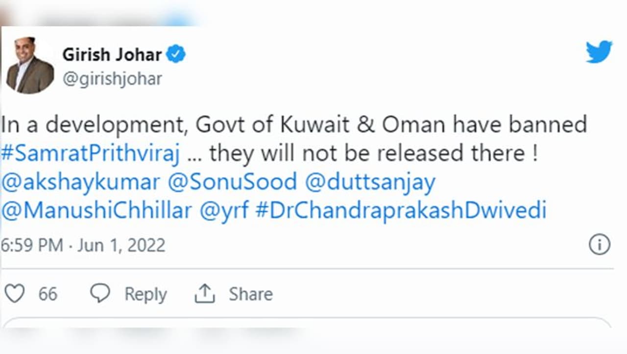 एंटरटेनमेंट डेस्क. अक्षय कुमार (Akshay Kumar) स्टारर हिस्टोरिकल ड्रामा 'सम्राट पृथ्वीराज' (Samrat Prithviraj) रिलीज से पहले ही ओमान और कुवैत में बैन हो गई है। ट्रेड एनालिस्ट गिरीश जौहर ने इस बात की जानकारी सोशल मीडिया पर दी है। उन्होंने लिखा है, "एक डेवलपमेंट में कुवैत और ओमान की सरकार ने 'सम्राट पृथ्वीराज' पर प्रतिबंध लगा दिया है। वे यह फिल्म वहां रिलीज नहीं करेंगे।"