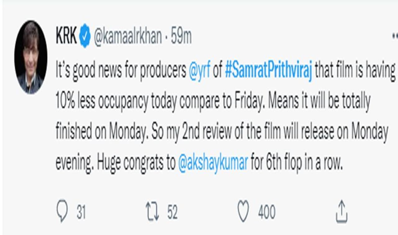 एंटरटेनमेंट डेस्क. अक्षय कुमार (Akshay Kumar) की फिल्म सम्राट पृथ्वीराज (Samrat Prithviraj) बॉक्स ऑफिस पर कोई खास कमाल नहीं दिखा पा रहा है। इसे लेकर मिली जुली प्रतिक्रिया भी सामने आ रही है। कुछ लोगों को यह फिल्म बहुत पसंद आ रही है तो कुछ लोग इस मूवी में खामियां निकाल रहे हैं। सोशल मीडिया पर अक्षय कुमार का मजाक उड़ाया जा रहा है। आइए इसके पीछे की वजह जानते हैं।