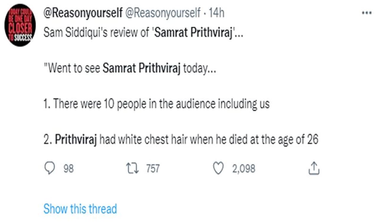 Samrat Prithviraj: सम्राट पृथ्वीराज 3 जून को सिनेमाघरों में रिलीज हो चुकी है। फिल्म को लेकर मिली जुली प्रतिक्रिया सामने आ रही है। इस बीच अक्षय कुमार की फिल्म का मजाक भी उड़ाया जाने लगा है।