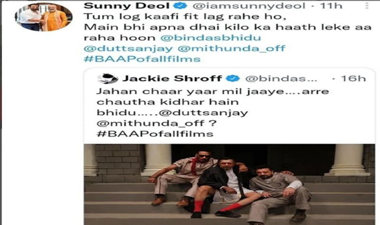जैकी श्रॉफ ने भी अपने ट्विटर हैंडल पर तस्वीर शेयर करते हुए लिखा,'जहां चार यार मिल जाए...अरे चौथा किधर है भिडू।' इस ट्वीट पर सनी देओल ने रिप्लाइ करते हुए लिखा,'तुम लोग काफी फिट लग रहे हो, मैं अपना ढाई किलो का हाथ लेकर आ रहा हूं।'