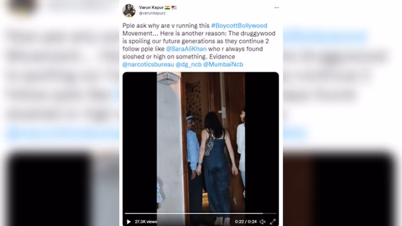 सारा का वीडियो शेयर करते हुए एक सोशल मीडिया यूजर ने लिखा है, "लोग पूछते हैं कि हम बायकॉट बॉलीवुड क्यों ट्रेंड कर रहे हैं? यहां एक कारण और है। ड्रगीवुड हमारी आने वाली पीढ़ियों को बिगाड़ रहा है। क्योंकि वे लगातार सारा अली खान जैसे लोगों को फॉलो कर रहे हैं, जो हमेशा किसी ना किसी चीज के नशे में पाए जाते हैं।" इसके आगे इस यूजर ने नारकोटिक्स कंट्रोल ब्यूरो, एनसीबी के डीजी और मुंबई एनसीबी को टैग करते हुए इस वायरल वीडियो को सबूत के तौर पर पेश किया है।