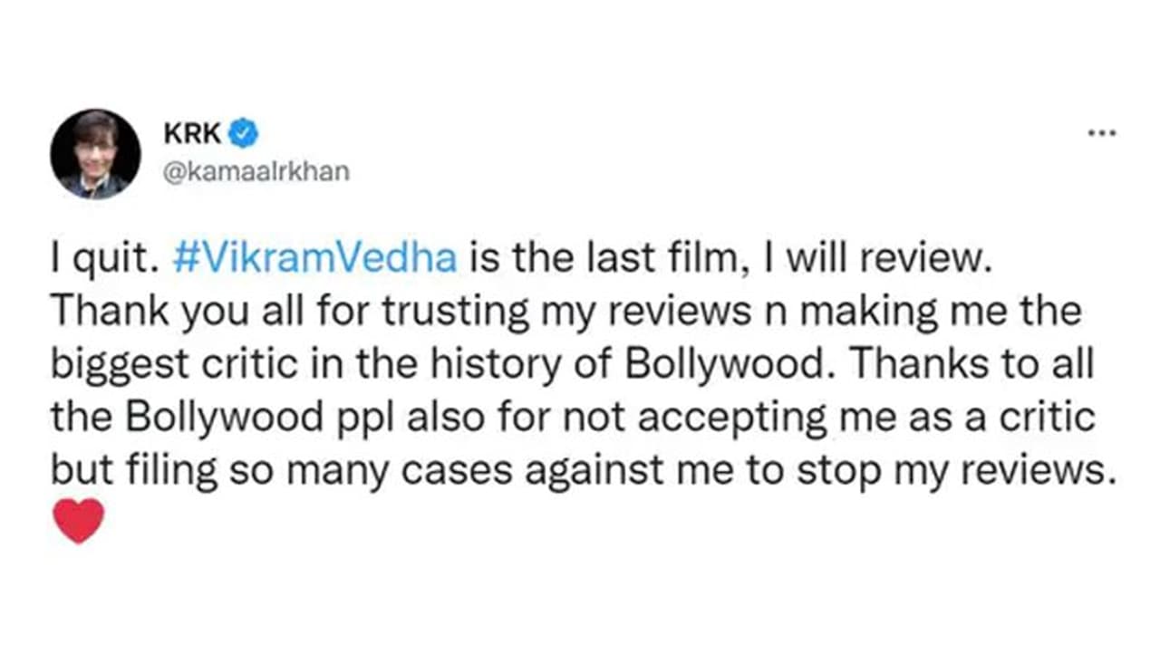 KRK ने ट्वीट करते हुए लिखा, 'आई क्विट। 'विक्रम वेधा' वह आखिरी फिल्म होगी जिसका मैं रिव्यू करूंगा। मुझ पर विश्वास करने के लिए और मुझे बॉलीवुड के इतिहास का सबसे बड़ा क्रिटिक्स बनाने के लिए शुक्रिया। बॉलीवुड के उन लोगों का भी धन्यवाद, जिन्होंने मुझे एक क्रिटिक के रूप में स्वीकार नहीं किया और मेरे रिव्यूज को रोकने के लिए मेरे खिलाफ इतने सारे केस दर्ज करा दिए।'