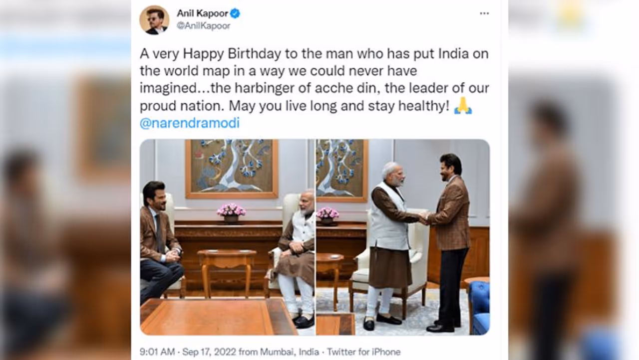 अनिल कपूर ने अपने अंदाज़ में मोदी को शुभकामनाएं देते हुए लिखा है, "भात को दुनिया के नक़्शे पर अकल्पनीय रूप से ला खड़ा करने वाले शख्स को जन्मदिन की बहुत-बहुत शुभकामनाएं। अच्छे दिनों के अग्रदूत, हमारे गौरवशाली राष्ट्र के नेता। आप दीर्घायु हों और स्वस्थ रहें।"