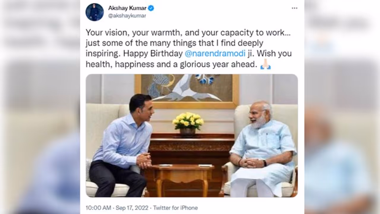 अक्षय कुमार ने लिखा है, "आपकी दृष्टि, आपकी गर्मजोशी और काम करने की आपकी क्षमता...कुछ ऐसी चीजें हैं, जो मुझे प्रेरणा देती हैं। जन्मदिवस की शुभकामनाएं नरेन्द्र मोदी जी। आपके स्वास्थ्य, खुशियों और आने वाले वर्ष के गौरवशाली होने की प्रार्थना करता हूं।"