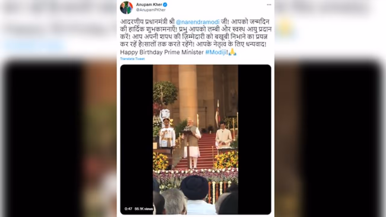 अभिनेता अनुपम खेर ने बधाई देते हुए ट्विटर पर लिखा है, "आदरणीय प्रधानमंत्री श्री नरेन्द्र मोदी जी! आपको जन्मदिन की हार्दिक शुभकामनाएं। प्रभु आपको लंबी और स्वस्थ आयु प्रदान करें। आप अपनी शपथ की जिम्मेदारी बखूबी निभाने का प्रयत्न कर रहे हैं। सालों तक करते रहेंगे। आपके नेतृत्व के लिए धन्यवाद।" अनुपम खेर ने मोदी जी के शपथ ग्रहण समारोह का वीडियो भी साझा किया है, जो उन्होंने प्रधानमंत्री बनने के बाद ली थी।