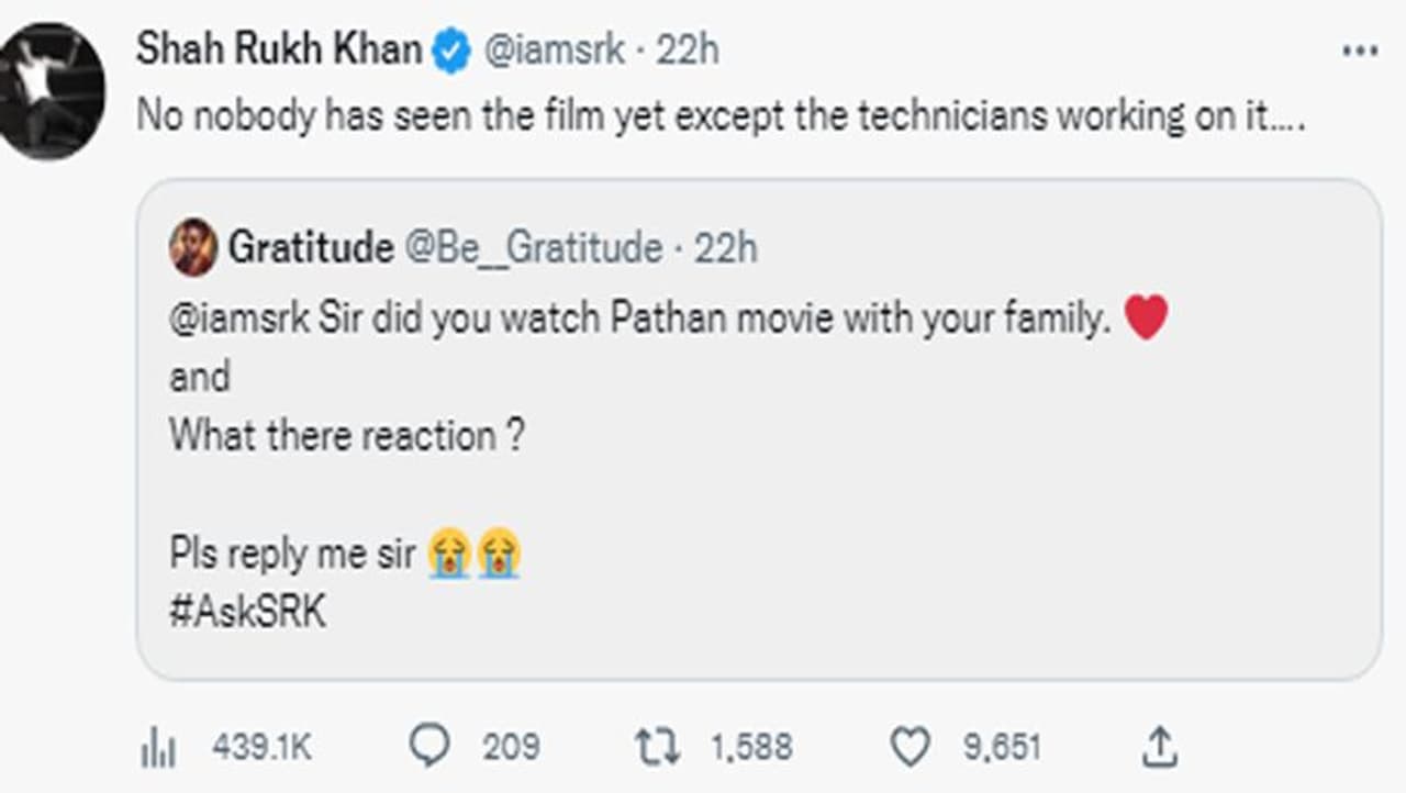 एक यूजर ने पूछा, "सर, क्या आपने परिवार के साथ पठान फिल्म देख ली है। कैसे रिएक्शन थे?" जवाब में उन्होंने लिखा, "अभी तक किसी ने फिल्म नहीं देखी, क्योंकि टेक्नीशियंस अभी इस पर काम कर रहे हैं।"