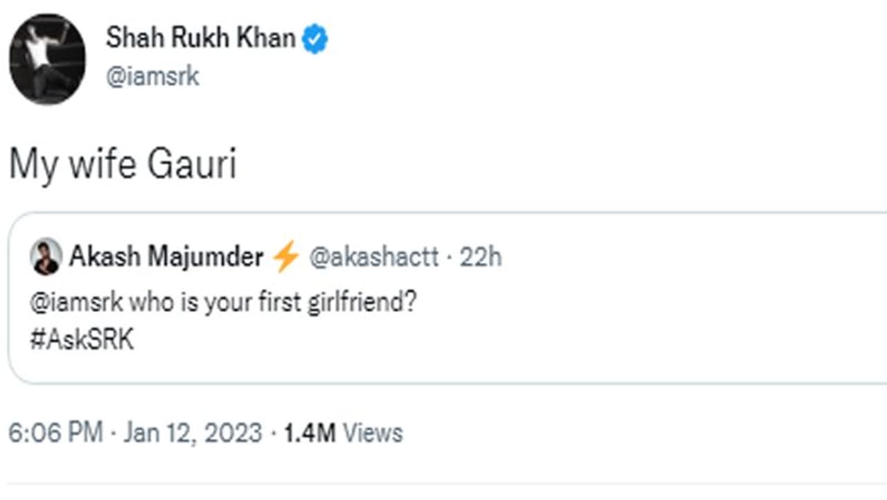 एक इंटरनेट यूजर ने तो किंग खान से उनकी पहली गर्लफ्रेंड के बारे में तक पूछ लिया। उसने लिखा, "आपकी पहली गर्लफ्रेंड कौन है?" जवाब में में शाहरुख़ ने लिखा, "मेरी पत्नी गौरी।"