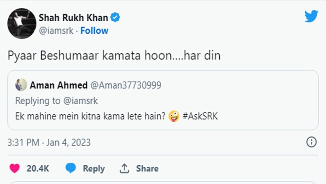 इसी तरह एक यूजर ने पूछा, "एक महीने में कितना कमा लेते हैं?" तो SRK ने कहा, "प्यार बेशुमार कमाता हूं...हर दिन।"