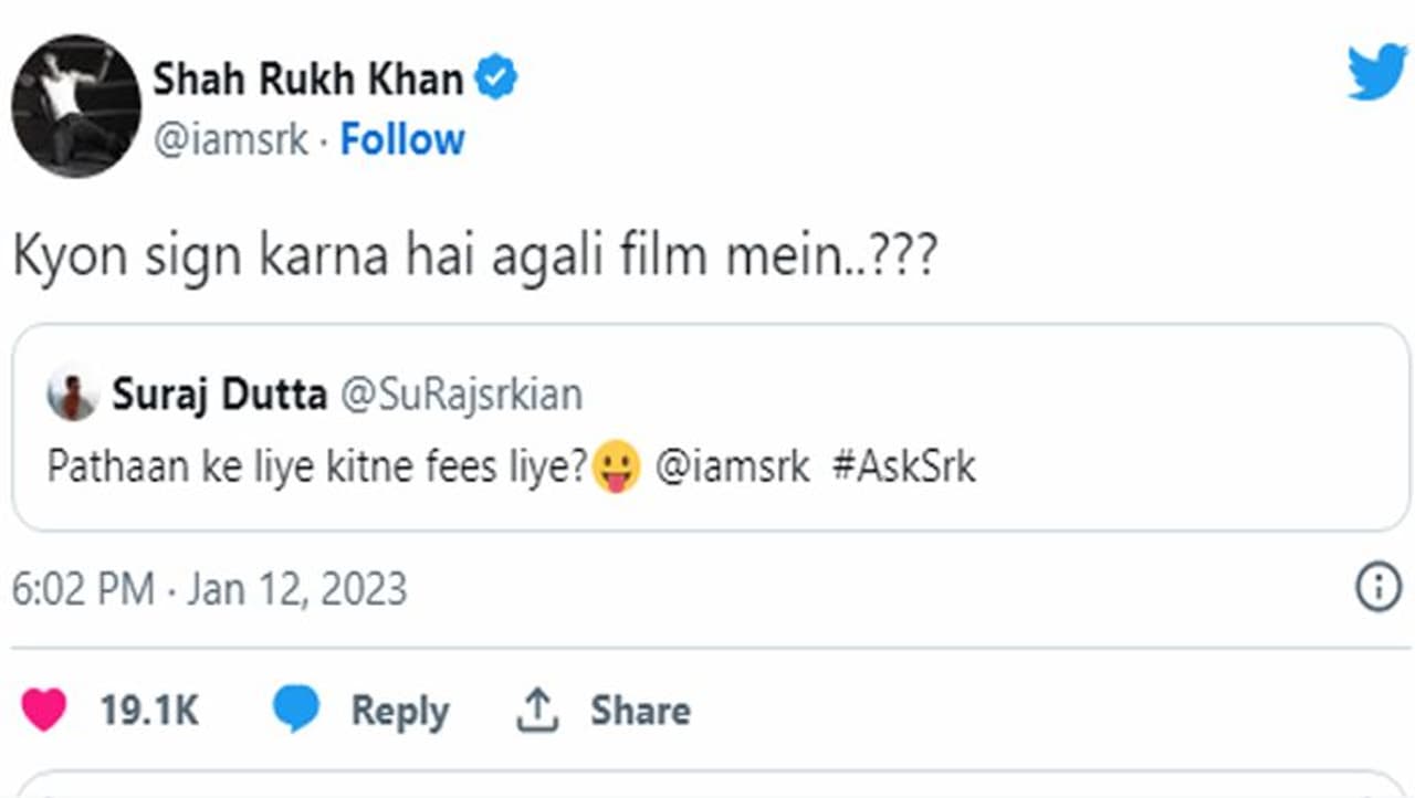 एक इंटरनेट यूजर ने शाहरुख़ खान से पूछा, "पठान के लिए कितनी फीस लिए?" जवाब में शाहरुख़ ने कहा, "क्यों साइन करना है अगली फिल्म में?"