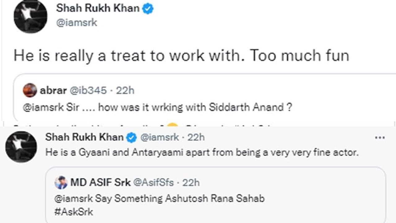 शाहरुख़ खान से इस दौरान 'पठान' के डायरेक्टर सिद्धार्थ आनंद के बारे में भी रिएक्शन मांगा गया। एक इंटरनेट यूजर ने पूछा, "सर, सिद्धार्थ आनंद के साथ काम करके कैसा लगा?" जवाब में SRK ने कहा, "वे साथ में काम करने के लिए एक ट्रीट की तरह हैं। बहुत मजा आया।" वहीं, एक यूजर ने उनसे आशुतोष राणा के बारे में पूछा। उसने लिखा, "आशुतोष राणा साहब के बारे में कुछ कहिए?" शाहरुख़ ने जवाब दिया, "वे बेहतरीन एक्टर होने के अलावा ज्ञानी और अन्तर्यामी हैं।"