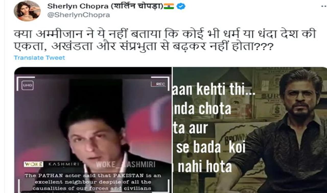 शर्लिशर्लिन चोपड़ा ने इस वीडियो को अपने ट्विटर अकाउंट से शेयर करते हुए शाहरुख खान पर तंज कसा है। एक्ट्रेस ने लिखा,'क्या अम्मीजान ने ये नहीं बताया कि कोई भी धर्म या धंधा देश की एकता, अखंडता और संप्रभुता से बढ़कर नहीं होता???' इस वीडियो को खबर लिखे जाने तक 100 से ज्यादा लोग शेयर कर चुके हैं और लगातार इसे शेयर किया जा रहा है। इतना ही नहीं पुराने वीडियो पर लोग किंग खान को ट्रोल भी करने लगे हैं। इस लिंक पर क्लिक करके आप भी वीडियो देख सकते हैं।