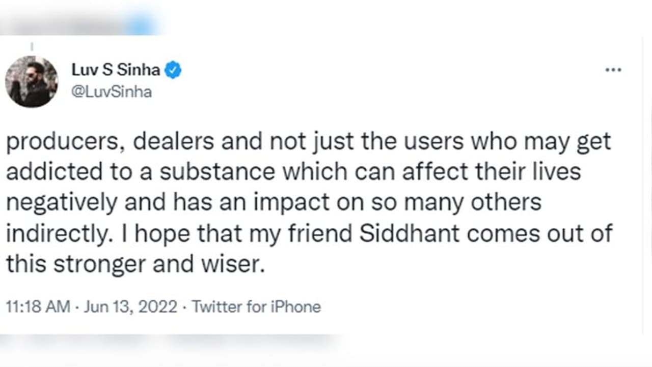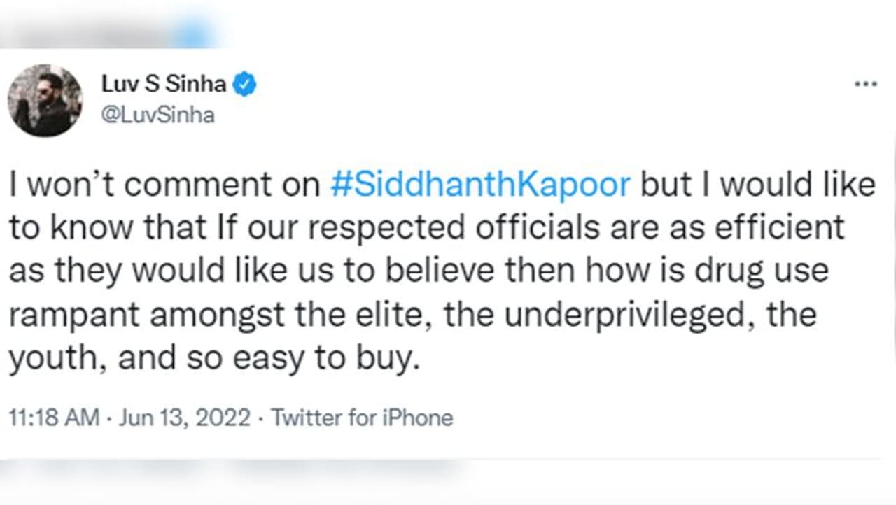 शत्रुघ्न सिन्हा के बेटे लव सिन्हा का कहना है ड्रग्स लेने वालों की बजाय इसे बनाने वालों और इसके डीलरों को गिरफ्तार किया जाना चाहिए। उन्हें सिद्धांत कपूर को हिरासत में लिए जाने के बाद तीन ट्वीट किए हैं।