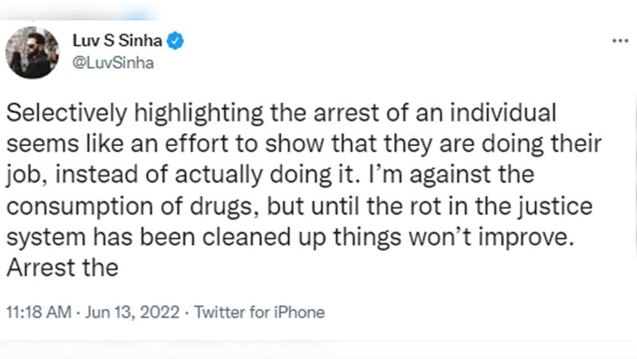लव सिन्हा अगले ट्वीट में लिखते हैं, "किसी भी इंसान की गिरफ्तारी को चुनकर उसे हाईलाइट करना कहीं न कहीं यह दिखाता है कि असल में काम करने की बजाय काम करने का दिखावा किया जा रहा है। मैं ड्रग्स के सेवन के खिलाफ हूं। लेकिन जब तक न्यायिक प्रणाली की सडन साफ़ नहीं होती, तब न तो चीजें साफ़ होंगी और न ही ये सुधरेंगी।"