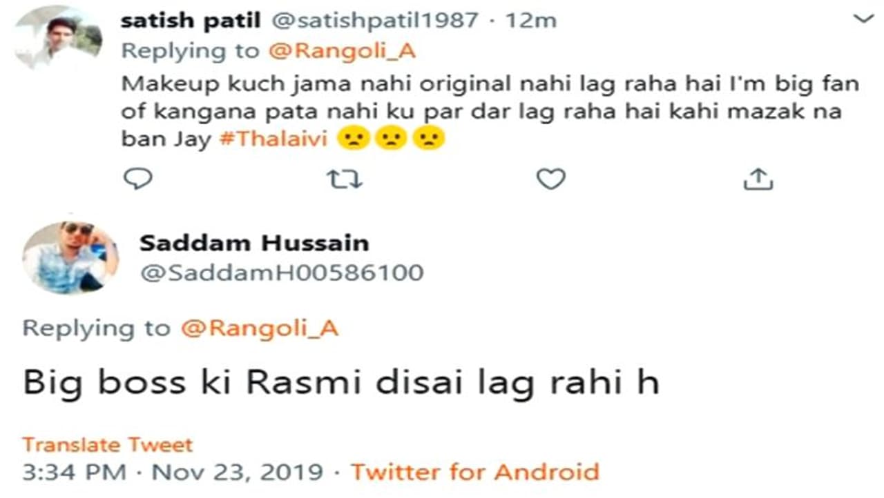 एक अन्य यूजर ने कमेंट करते हुए कहा- " ये तो बिग बॉस की रश्मि देसाई लग रही है।" वहीं एक अन्य यूजर ने लिखा- "क्या प्रोडक्शन हाउस प्रोस्थेटिक मेकअप टीम को रखना भूल गया था?" एक और यूजर ने कहा- ''मेकअप और लुक डरावना है। बेहद निराशाजनक, रियल लुक से बिल्कुल भी मैच नहीं कर रहा।" एक शख्स बोला- और तुम मेकअप के लिए तापसी (पन्नू) और भूमि (पेडनेकर) का मजाक उड़ाती हो? ये क्या है...टेडी बेयर?" बता दें कि एआईएडीएमके की नेता और एक्ट्रेस जयललिता की बायोपिक पर बन रही इस फिल्म में कंगना लीड रोल प्ले कर रही हैं।