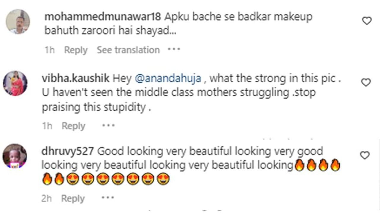 एक यूजर ने लिखा है, "आपको बच्चे से बढ़कर मेकअप बहुत जरूरी है शायद।" एक यूजर ने आनंद आहूजा के कमेंट पर निशाना साधते हुए लिखा है, "इस तस्वीर में स्ट्रॉन्ग क्या है? आपने मिडिल क्लास मांओं को संघर्ष करते नहीं देखा। इस मूर्खता की तारीफ़ करना बंद करो।" एक यूजर का कमेंट है, "क्या कोई मुझे बता सकता है कि इस तस्वीर में सुपरमॉम जैसा क्या है? वाकई...? बाहर जाइए और असल दुनिया में असल सुपरमॉम्स को देखिए।"