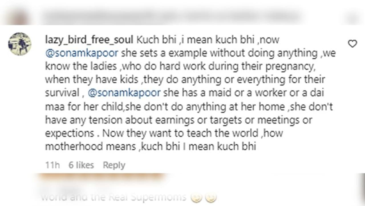 कई इंटरनेट यूजर्स सोनम को ट्रोल कर रहे हैं। मसलन, एक यूजर ने लिखा है, "कुछ भी मतलब कुछ भी। अब सोनम कपूर बिना कुछ किए उदाहरण सेट करेंगी। हम ऐसी कई महिलाओं को जानते हैं, जो अपनी प्रेग्नेंसी के दौरान कड़ी मेहनत करती हैं। जब उनके बच्चे हो जाते हैं तो वे उनके सर्वाइवल के लिए सब कुछ करती हैं। सोनम कपूर के पास उनके बच्चे के लिए नौकरानी है या काम करने वाले हैं या दाई मां है। वे अपने घर में कुछ नहीं करतीं। उन्हें कमाने की या टार्गेट की या मीटिंग्स की या किसी और चीज की कोई टेंशन नहीं है। अब वे दुनिया को सिखाना चाहते हैं कि मदरहुड का मतलब क्या होता है?"