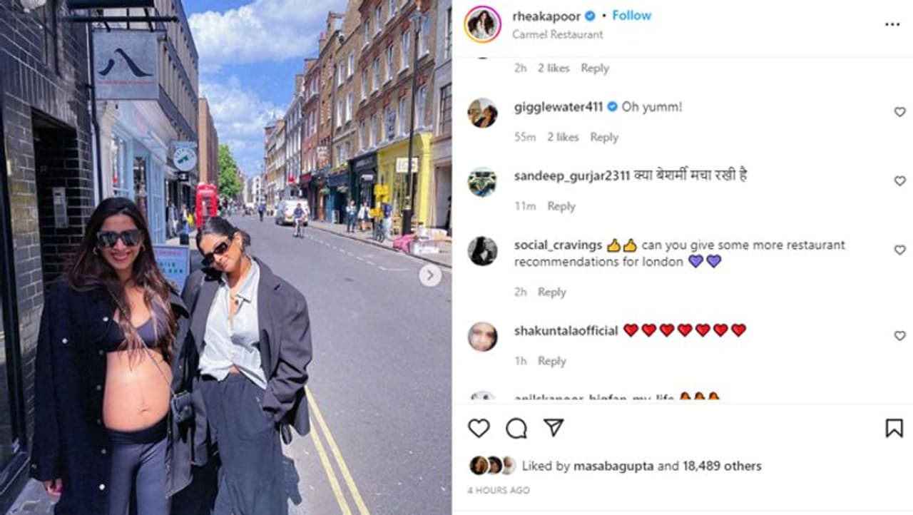 सोनम कपूर की बहन रिया ने सोशल मीडिया पर उनके साथ अपनी एक फोटो शेयर की है। लंदन के एक रेस्टोरेंट के बाहर ली गई इस फोटो में सोनम जिस अंदाज़ में बेबी बंप फ्लॉन्ट कर रही हैं, वह लोगों को बिलकुल भी पसंद नहीं आ रहा है।