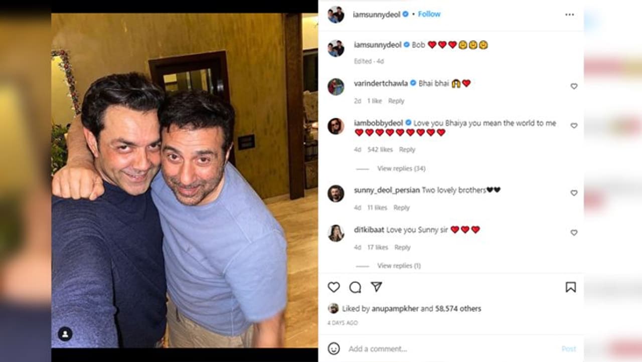 सनी देओल फिजिकली भले ही एक्टिव न हों, लेकिन सोशल मीडिया पर वे लगातार एक्टिव हैं। चार दिन पहले ही उन्होंने अपने छोटे भाई बॉबी देओल के साथ एक तस्वीर शेयर की थी, जिसमें दोनों काफी खुश लग रहे थे। सनी ने इस पोस्ट के साथ न लोकेशन साझा की थी और न ही कैप्शन में 'बॉब' और हार्ट और ख़ुशी की इमोजी के अलावा कुछ और लिखा था। तस्वीर पर कमेंट करते हुए बॉबी ने सनी पर प्यार लुटाया था। उन्होंने हार्ट की इमोजी साझा करते हुए लिखा था, "लव यू भैया, आप मेरी दुनिया हो।"