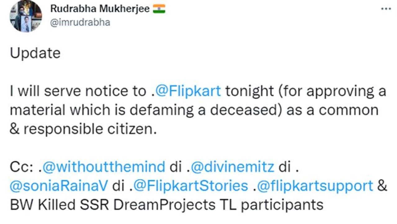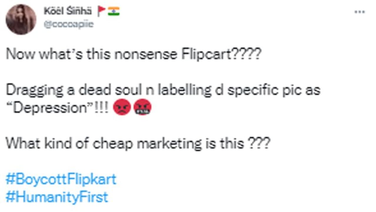 एक सोशल मीडिया यूजर ने लिखा है, "एक आम और जिम्मेदार नागरिक के तौर पर मैं आज रात फ्लिपकार्ट को नोटिस (ऐसे मटेरियल को बेचने की इजाजत देने के लिए, जो मृतक का अपमान करता है) भेज रही हूं।"