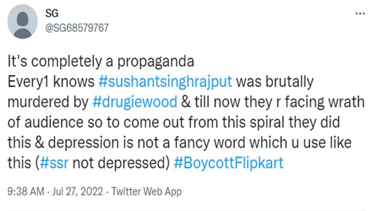 एक यूजर का ट्वीट है, "यह पूरी तरह प्रोपागैंडा है। हर कोई जानता है कि सुशांत सिंह राजपूत की ड्रगी बॉलीवुड ने निर्दयता से हत्या की और वे अब तक इसके लिए दर्शकों की नाराजगी का सामना कर रहे हैं। इसलिए इस कुंडली से बाहर आने के लिए उन्होंने ऐसा किया। डिप्रेशन कोई फैंसी वर्ड नहीं है, जिसका आप इस तरह से इस्तेमाल करते हैं।"