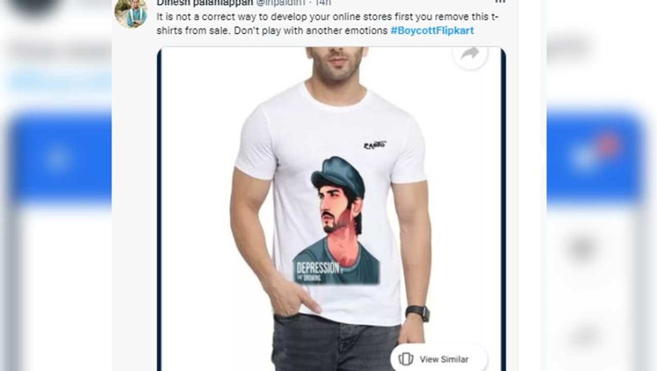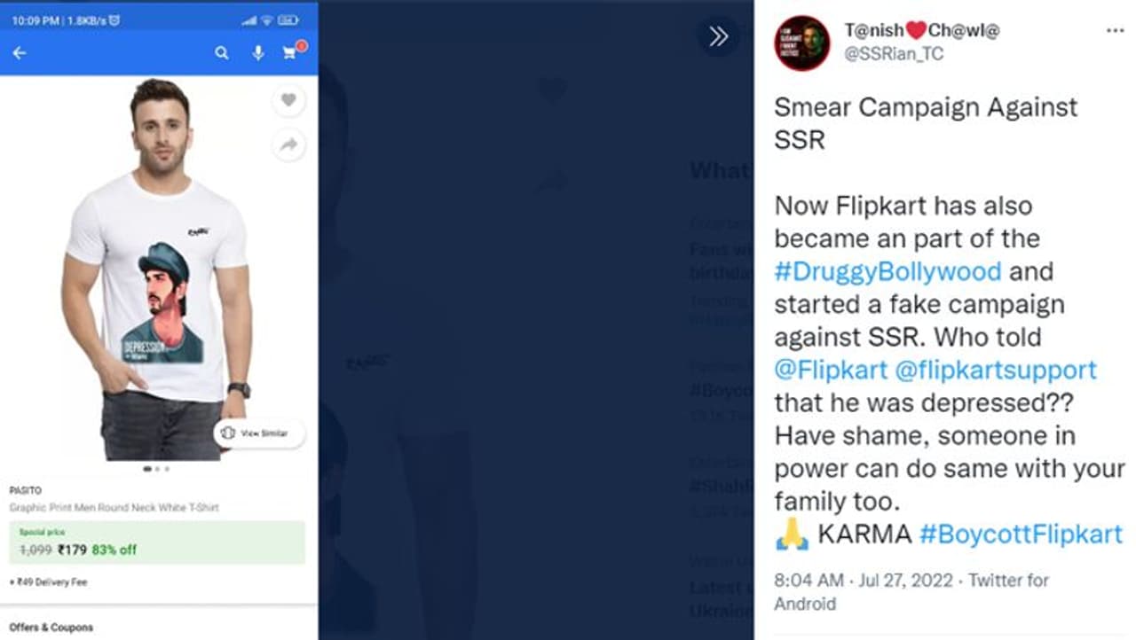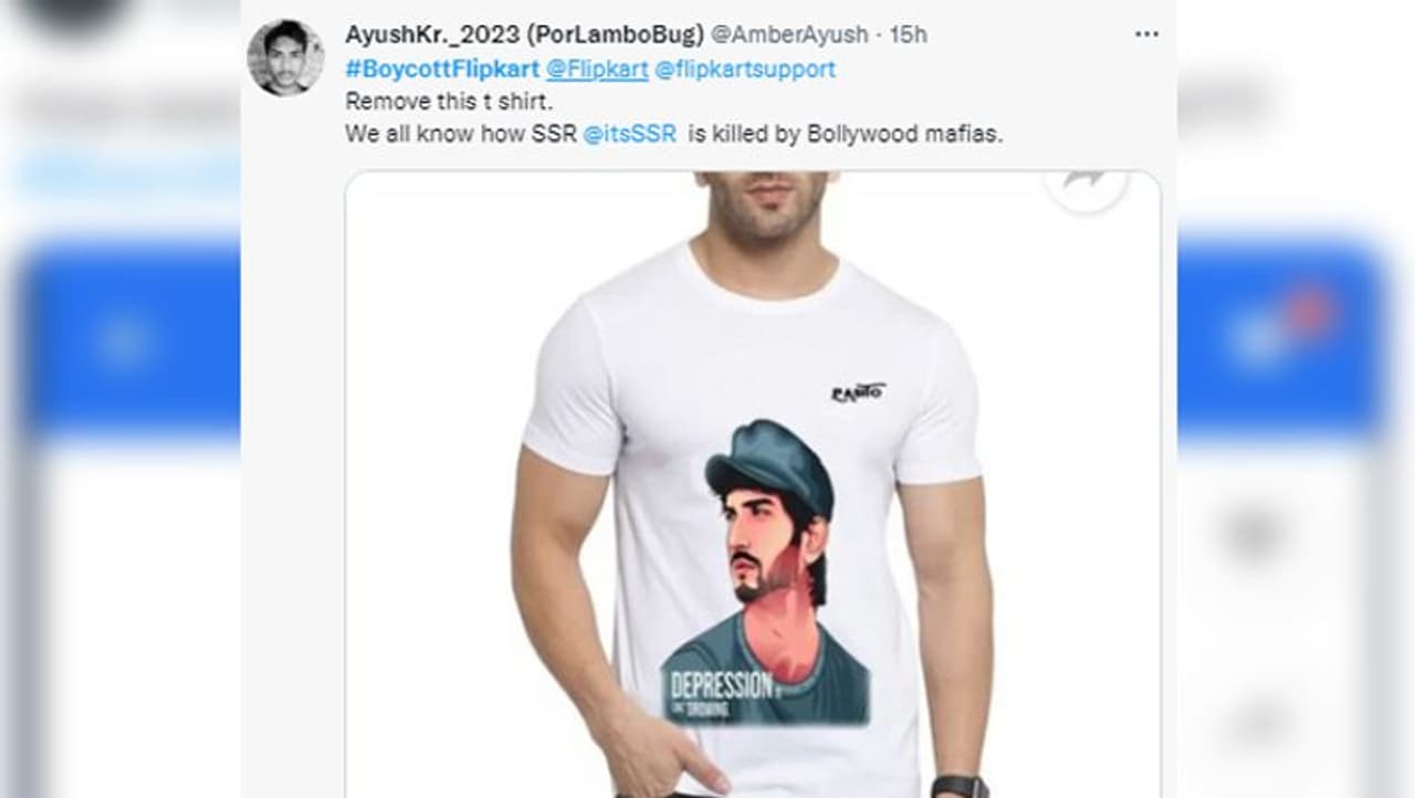 एंटरटेनमेंट डेस्क. ई-कॉमर्स कंपनी फ्लिपकार्ट (Flipkart) पर दिवंगत अभिनेता सुशांत सिंह राजपूत (Sushant Singh Rajput) का अपमान और उन्हें बदनाम करने का आरोप लग रहा है। कंपनी के खिलाफ ट्विटर पर बायकॉट का ट्रेंड भी चलाया गया। दरअसल, कंपनी की वेबसाइट पर एक टी-शर्ट बेची जा रही है, जिस पर सुशांत सिंह राजपूत की तस्वीर बनी है और 'Depression like drowning'(डिप्रेशन जैसे डूबना)। सुशांत के फैन्स ने जब यह टी-शर्ट देखी तो उन्होंने कंपनी के खिलाफ अभियान छेड़ दिया। इतना ही नहीं, रिपोर्ट्स की मानें तो लोगों ने भ्रामक कोट वाली इस टी-शर्ट को लेकर फ्लिपकार्ट के खिलाफ शिकायत भी दर्ज कराई है और कंपनी को नोटिस भी जारी किया है।