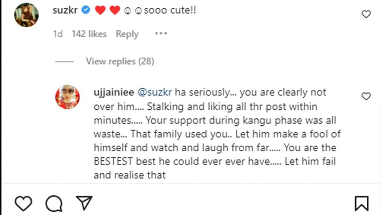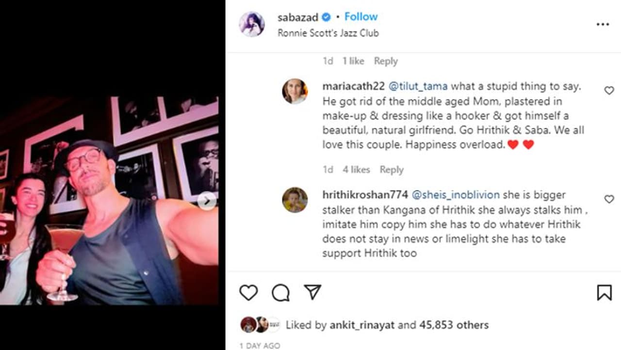 इस पोस्ट पर जहां फैंस ऋतिक और सबा को प्रमोट कर रहे हैं। वहीं सुजैन को उन्होंने ऋतिक की मदद से लाइमलाइट पाने वाला बताया है। एक यूजर ने तो यह तक कह दिया कि सुजैन, ऋतिक को कंगना से ज्यादा स्टॉक करती हैं। इस पोस्ट पर ऋतिक की कजिन पशमीना रोशन ने भी कमेट करते हुए लिखा, 'Jaazatastic'। वैसे आपको बता दें कि सुजैन इन दिनों एक्टर अरसलान गोनी को डेट कर रही हैं और कुछ ही वक्त पहले ऋतिक, सबा, सुजैन और अरसलान गोवा ट्रिप पर साथ नजर आए थे। वर्कफ्रंट की बात करें तो ऋतिक जल्द ही दीपिका पादुकोण के साथ 'फाइटर' की शूटिंग शुरू करेंगे।