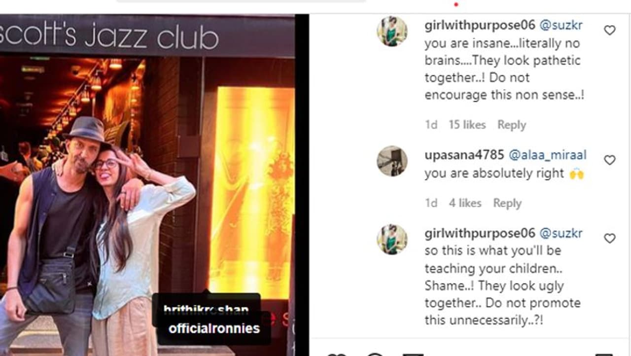 खास बात यह है कि दोनों कि इस तस्वीर पर ऋतिक की एक्स वाइफ सुजैन खान ने कमेंट भी किया है। सुजैन ने लिखा, 'सो क्यूट'। सुजैन के इस कमेंट पर कई लोगों ने उन्हें नसीहत दे डाली। एक यूजर ने लिखा, 'क्या आप पागल हो ? दोनों एक दूसरे के साथ एक दम पथैटिक लग रहे हैं। प्लीज इस तरह की बकवास को बढ़ावा मत दीजिए।' वहीं एक अन्य यूजर ने लिखा, 'क्या आप अपने बच्चों को यही सिखाना चाहते हैं? इस तरह की हरकतों को प्रमोट मत करिए।'