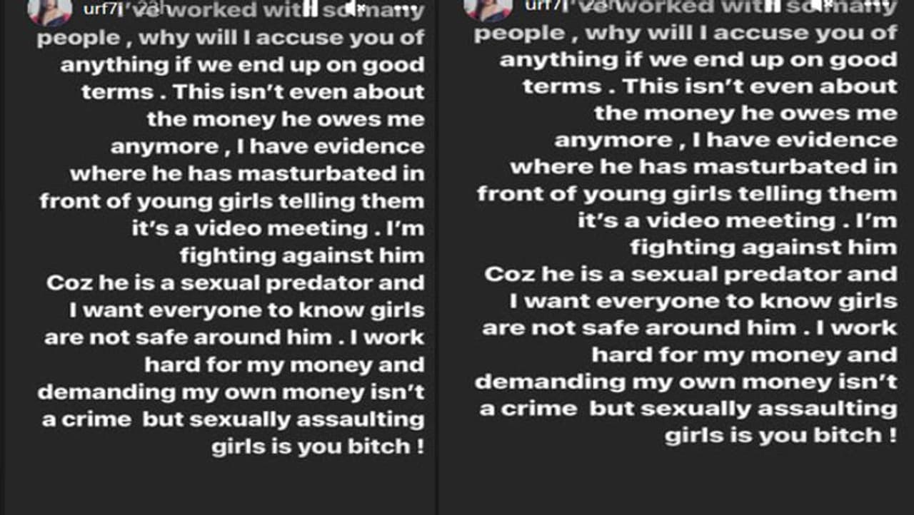 लड़कियों को बड़े सपने दिखाकर कथित तौर पर उनके साथ संबंध बनाने की मांग की। उन्होंने बताया कि ओबेद उन्हें म्यूजिक वीडियो में काम देने के बदले न्यूड वीडियो कॉल करने को कहता था। इसके साथ उन्होंने लड़कियों के साथ शारीरिक संबंध बनाने को कहा था। कास्टिंग डायरेक्टर से पीड़ित बाकी लड़कियों ने भी उर्फी का साथ दिया है। उन्होंने ने अपने अलावा दूसरी लड़कियों के भी स्क्रीनशॉट शेयर किए हैं।