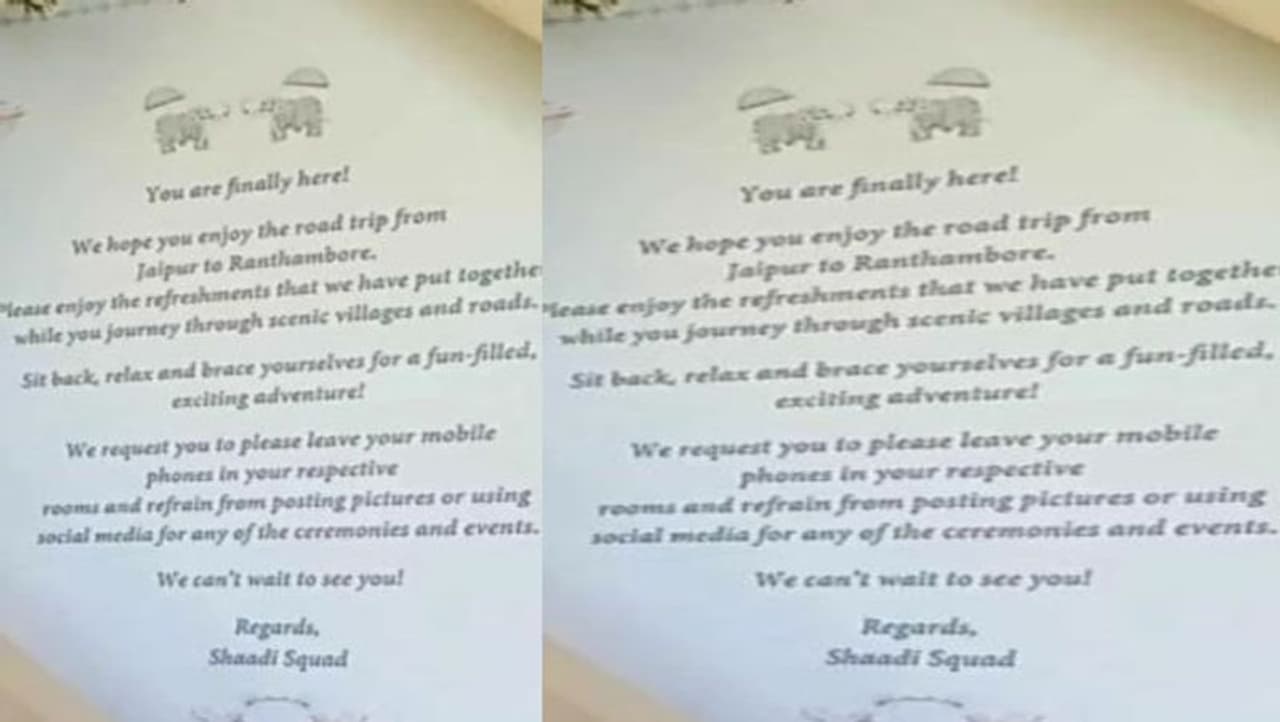 इसके आगे वेलकम नोट में लिखा है, 'आपसे अनुरोध करते हैं कि कृपया अपने मोबाइल फोन को अपने संबंधित कमरों में छोड़ दें और किसी भी समारोह और कार्यक्रमों के लिए तस्वीरें पोस्ट करने या सोशल मीडिया का उपयोग करने से बचें। हम आपको देखने के लिए इंतजार नहीं कर सकते! सादर, शादी स्क्वाड।'