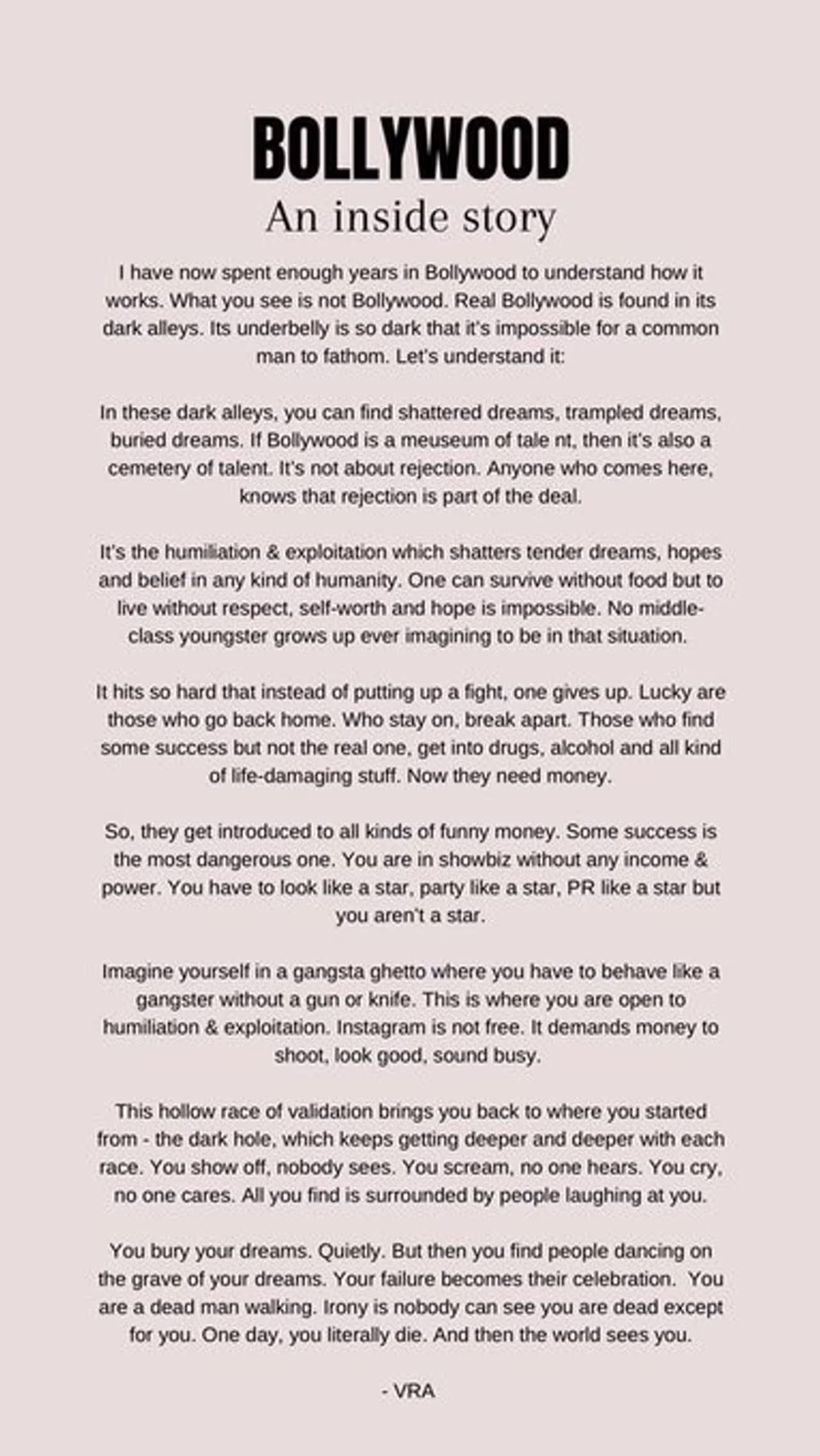 विवेक आगे लिखते हैं, "यह अपमान और शोषण है, जो किसी भी तरह की इंसानियत के कोमल सपनों, उम्मीदों और यकीन को तोड़ देता है। इंसान खाने के बगैर ज़िंदा रह सकता है, लेकिन सम्मान, स्वाभिमान और उम्मीद के बिना उसका जीना असंभव है। कोई भी मिडिल क्लास युवा इस तरह की सिचुएशन के बारे में सोचकर बड़ा नहीं हुआ। यह इतनी बुरी तरह प्रहार करता है कि कोई भी लड़ने की बजाय हार मान लेता है। वे खुशकिस्मत होते हैं, जो घर लौट जाते हैं। जो यहां रुक जाते हैं, वे टूटकर अलग हो जाते हैं। कुछ लोग सफल हो जाते हैं, लेकिन उन्हें असली सफलता नहीं मिलती। वे ड्रग्स, शराब और सभी तरह की नुकसानदायक चीजों के आती हो जाते हैं। अब उन्हें पैसे की जरूरत होती है तो वे सभी तरह के फनी पैसे को इंट्रोड्यूस करते हैं। कुछ सफलताएं ज्यादा खतरनाक होती हैं।आप ग्लैमर वर्ल्ड में बिना पैसे और पावर के होते हैं। आपको स्टार की तरह दिखना है, स्टार की तरह पार्टी करनी है, स्टार की तरह पीआर करना है, लेकिन आप स्टार नहीं हैं।"