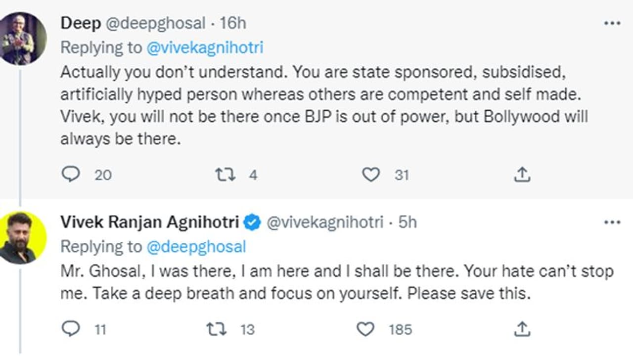 विवेक की पोस्ट पर कमेंट करते हुए एक शख्स ने उन पर निशाना साधा और लिखा, "असल में तुम नहीं समझते। तुम एक स्टेट से स्पोंसर होने वाली सब्सिडी और आर्टिफिशियल हाइप के कारण बने इंसान हो, जबकि बाक़ी खुद के दम पर बने हैं। जब भाजपा नहीं होगी तो तुम वहां नहीं रहोगे, लेकिन बॉलीवुड हमेशा रहेगा।" इस पर विवेक ने करारा जवाब देते हुए लिखा है, "मैं वहां था, हूं और हमेशा रहूंगा। आपकी नफरत मुझे रोक नहीं सकती। गहरी सांस लो और अपने आप पर फोकस करो। इसे सेव कर लो।"