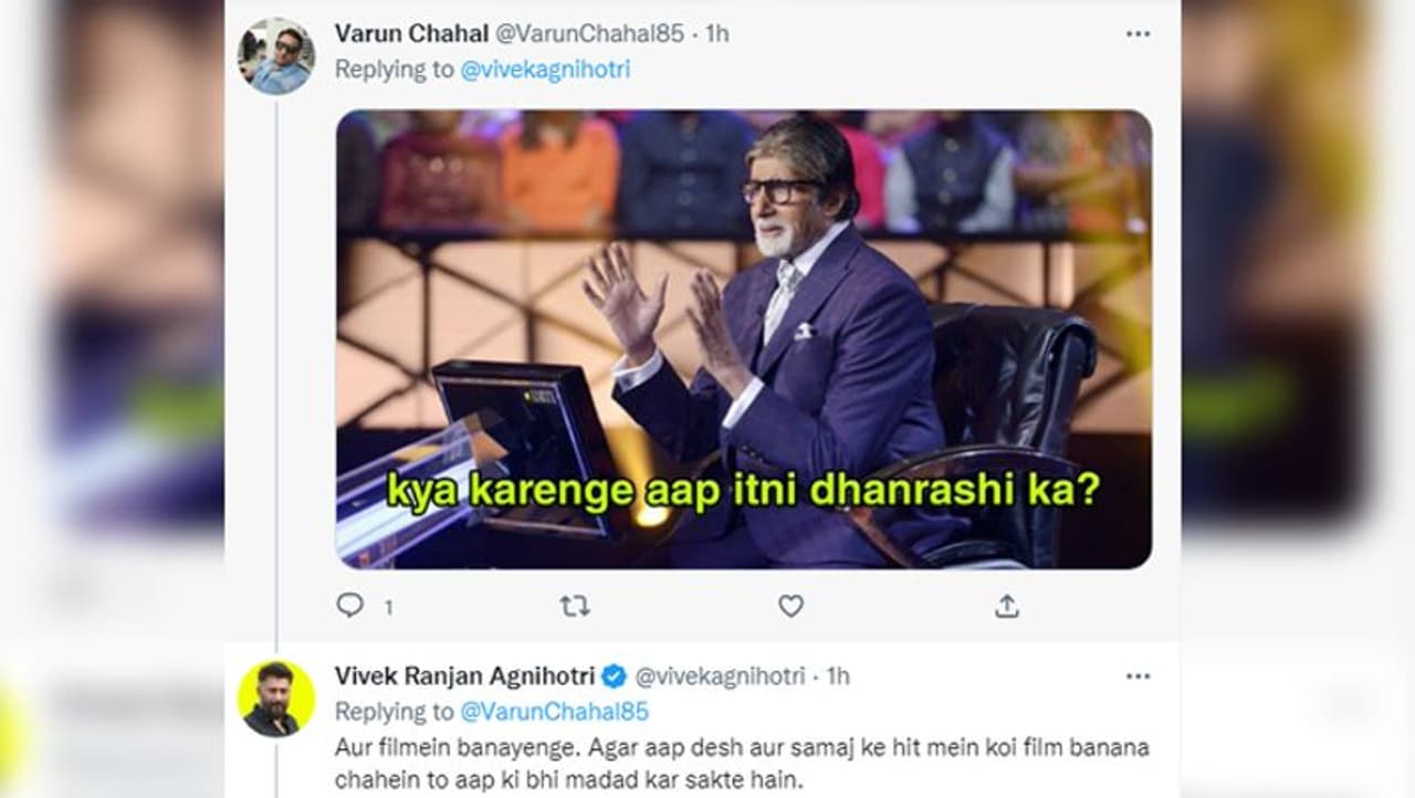 एक अन्य यूजर ने से लिखा, "क्या करेंगे आप इतनी धनराशि का?" जवाब में विवेक ने लिखा, "और फ़िल्में बनाएंगे।अगर आप देश और समाज के हित में कोई फिल्म बनाना चाहें तो आपकी भी मदद कर सकते हैं।"