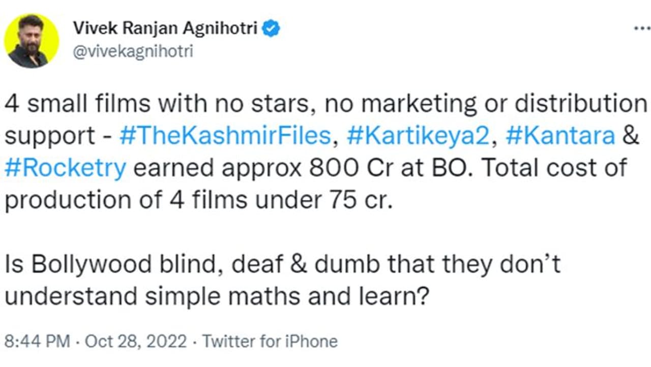 विवेक ने अपनी पोस्ट में लिखा है, " 4 छोटी फ़िल्में, ना स्टार्स, ना मार्केटिंग या डिस्ट्रीब्यूशन सपोर्ट- द कश्मीर फाइल्स, कार्तिकेय 2, कांतारा और रॉकेट्री ने बॉक्स ऑफिस पर लगभग 800 करोड़ रुपए कमाए। चारों फिल्मों के प्रोडक्शन की टोटल लागत 75 करोड़ रुपए से कम है। क्या बॉलीवुड अंधा, बहरा और गूंगा है, जो कि सिम्पल से गणित को समझ और सीख नहीं पा रहा है।"