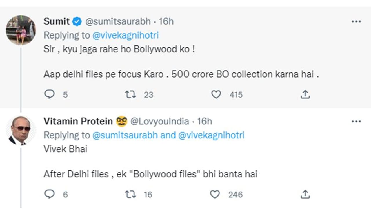 एक अन्य यूजर ने विवेक को उनकी फिल्म 'द दिल्ली फाइल्स' पर फोकस करने की सलाह दी। उसने लिखा है, "सर, क्यों जगा रहे हो बॉलीवुड को? आप दिल्ली फाइल्स पर फोकस करो। 500 करोड़ बॉक्स ऑफिस कलेक्शन करना है।" वहीं, एक यूजर ने उन्हें दिल्ली फाइल्स के बाद एक बॉलीवुड फाइल्स बनाने कि सलाह भी दी है।