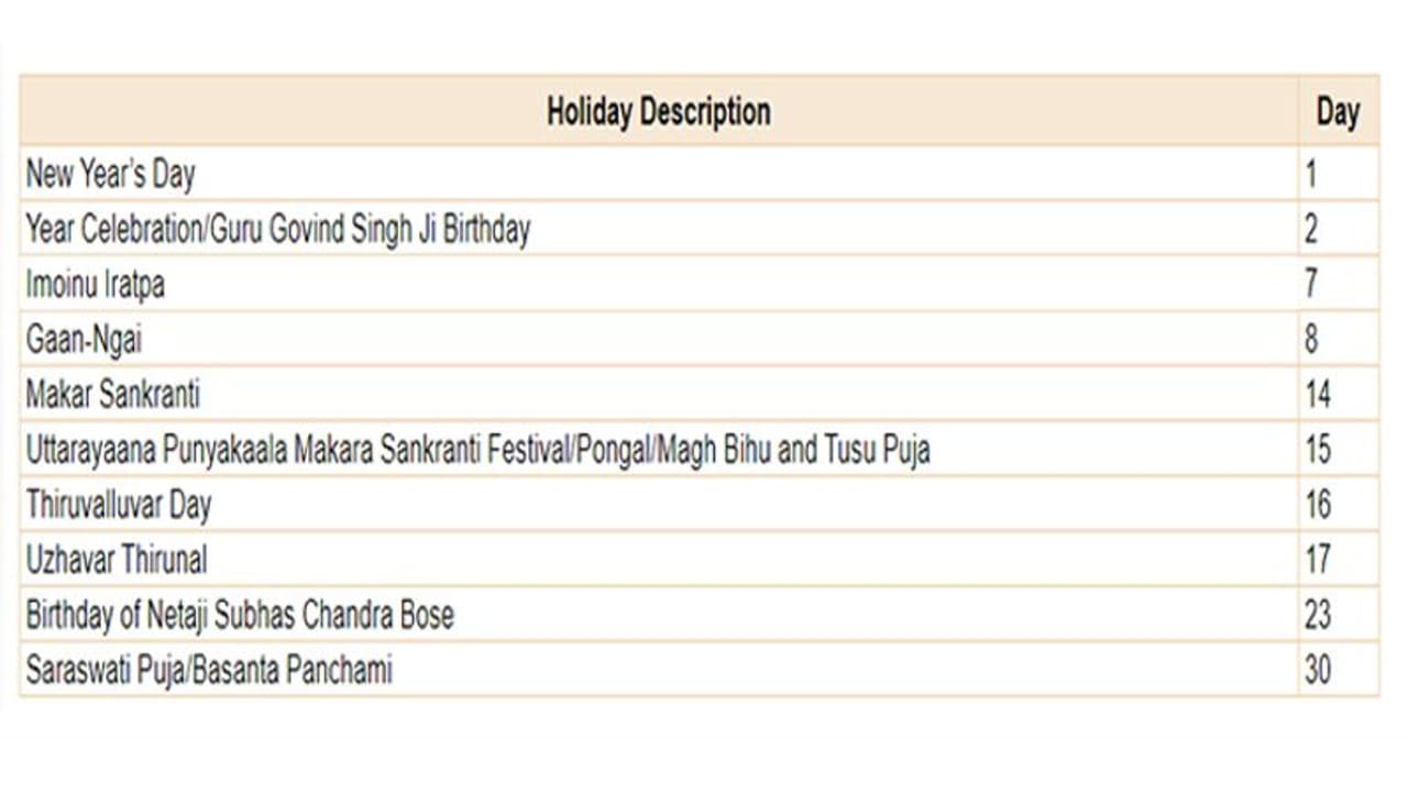 15 जनवरीः Uttarayaana Punyakaala Makara Sankranti Festival/Pongal/Magh Bihu और Tusu Puja के कारण के कारण कर्नाटक के बेंगलुरू, तमिलनाडु के चेन्नई, असम के गुवाहाटी और हैदराबाद (तेलंगाना) में बैंक छुट्टी।