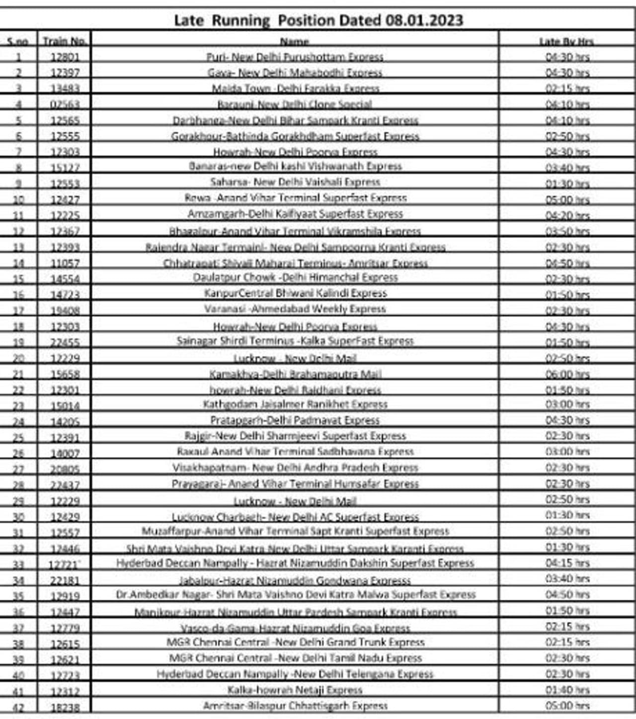 यात्रियों को हमारी सलाह है कि वे जब भी यात्रा के लिए घर से निकले तो पहले ट्रेन या फ्लाइट का शेड्यूल पता कर लें, क्योंकि बिना देखे जाने पर आपको घंटों इंतजार करना पड़ सकता है। फिलहाल हम आपको देरी से चल रही ट्रेनों की जानकारी दे रहे हैं। ओडिशा के पुरी से नई दिल्ली जाने वाली पुरुषोत्तम एक्सप्रेस ट्रेन करीब चार घंटे की देरी से चल रही है। यही नहीं बनारस से नई दिल्ली जाने वाली काशी विश्वनाथ एक्सप्रेस ट्रेन भी निर्धारित समय से कई घंटे की देरी से चल रही है।