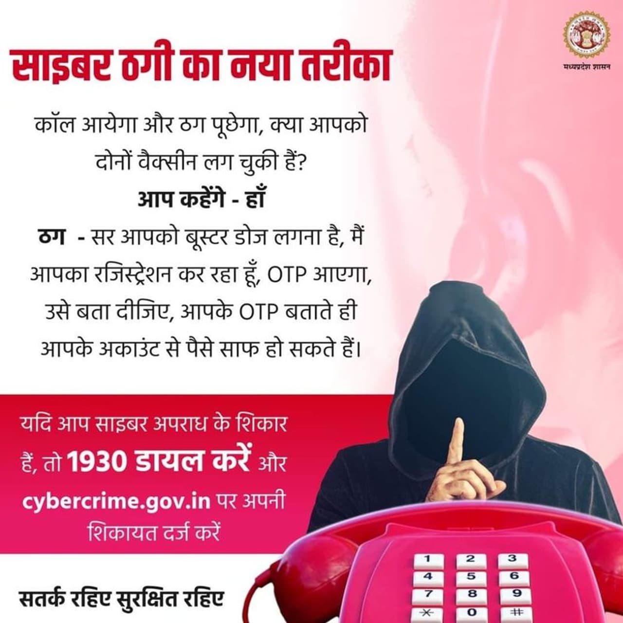 आपको बता दें कि सरकार ने बूस्टर डोज लगाने के लिए हाल ही में नया आदेश भी जारी किया है कि 15+ आयू के लोगों को फ्री में टीका लगवाया जाएगा। इससे पहले फ्रंट लाइन वर्कर्स और 60 साल से ज्यादा उम्र वाले लोगों को बूस्टर डोज लगवाई जा रही थी। बस इसी बात का फायदा साइबर ठग उठा रहे थे। गृह मंत्रालय ने भी इस तरह की ठगी से सतर्क रहने के लिए वीडियो जारी किया था। आपको बता दें कि कई जिलों से मिली शिकायत के आधार पर एक बार फिर साइबर सेल ने सतर्क रहने की सलाह दी है। साथ ही किसी को किसी भी तरह का ओटीपी नहीं बताने को कहा गया है।