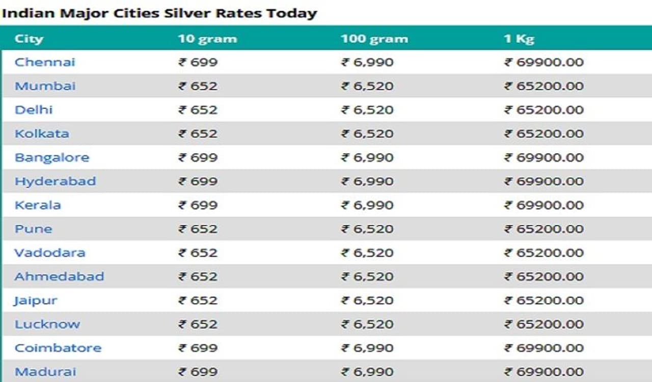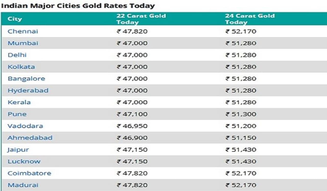 गुडरिटर्न्स वेबसाइट के मुताबिक, दिल्ली, कोलकाता और मुंबई में 24 कैरेट सोना 51,280 रुपये पर बिक रहा है. इन शहरों में 22 कैरेट सोने की कीमत 47,000 रुपए है। चेन्नई में 24 कैरेट सोना 52,170 रुपए पर बिक रहा है। चेन्नई में 22 कैरेट सोने की कीमत 47,820 रुपए है। उत्पाद शुल्क, राज्य करों और मेकिंग चार्ज के कारण देश भर में सोने और चांदी की कीमतें बदलती रहती हैं। चेन्नई में 1 किलो चांदी की कीमत 69,900 रुपए है। दिल्ली, कोलकाता और मुंबई में कीमत 65,200 रुपए है।