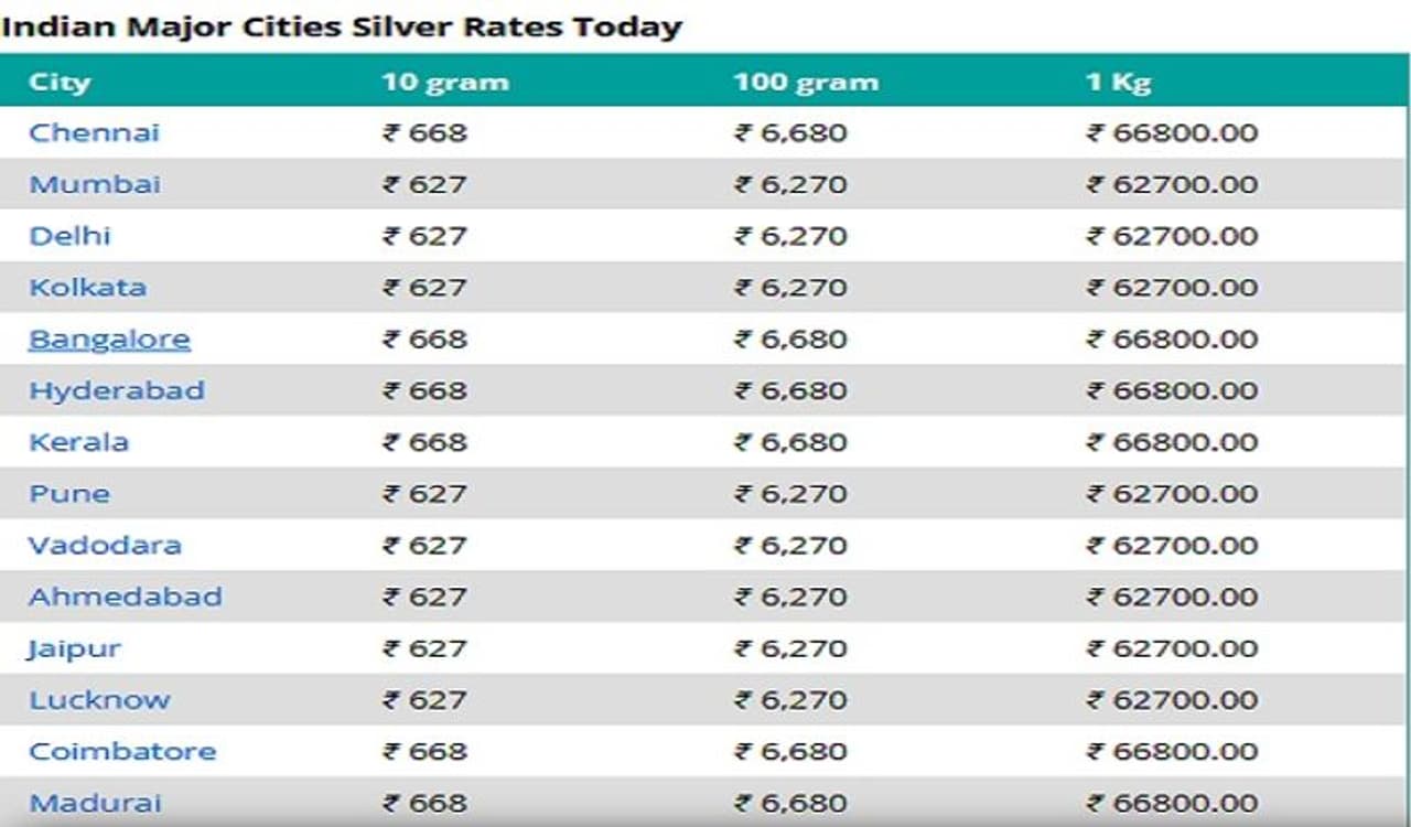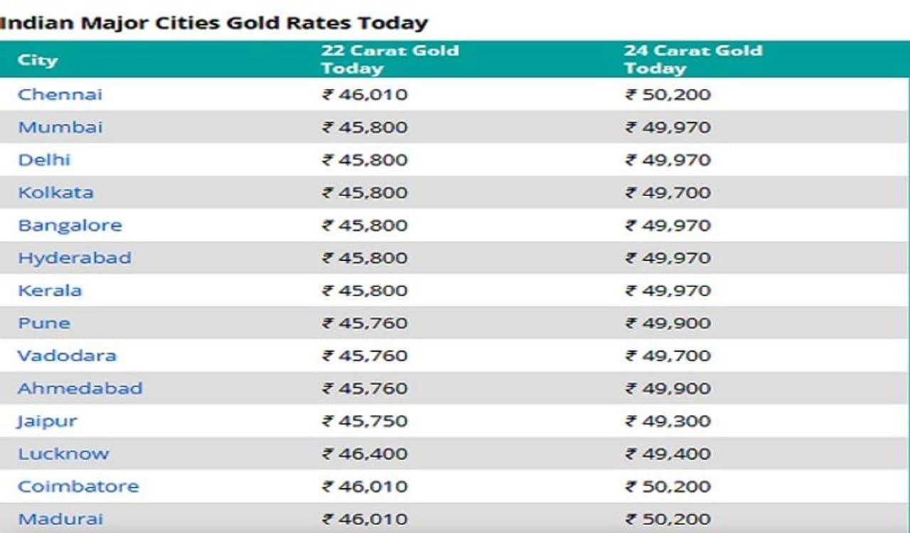 गुडरिटर्न्स वेबसाइट के मुताबिक, दिल्ली और मुंबई में 24 कैरेट सोना 49,970 रुपये पर बिक रहा है। दोनों शहरों में 22 कैरेट की कीमत 45,800 रुपये है। कोलकाता और चेन्नई में 24 कैरेट सोना 49,970 रुपये और 50,200 रुपये पर बिक रहा है। 22 कैरेट की कीमत चेन्नई में 46,010 रुपये और कोलकाता में 45,800 रुपये है। उत्पाद शुल्क, राज्य करों और मेकिंग चार्ज के कारण देश भर में सोने और चांदी की कीमतें बदलती रहती हैं। चेन्नई में 1 किलो चांदी की कीमत 66,800 रुपये है. दिल्ली और मुंबई में कीमत 62,700 रुपये है। कोलकाता में चांदी 62,700 रुपये प्रति किलो बिक रही है।