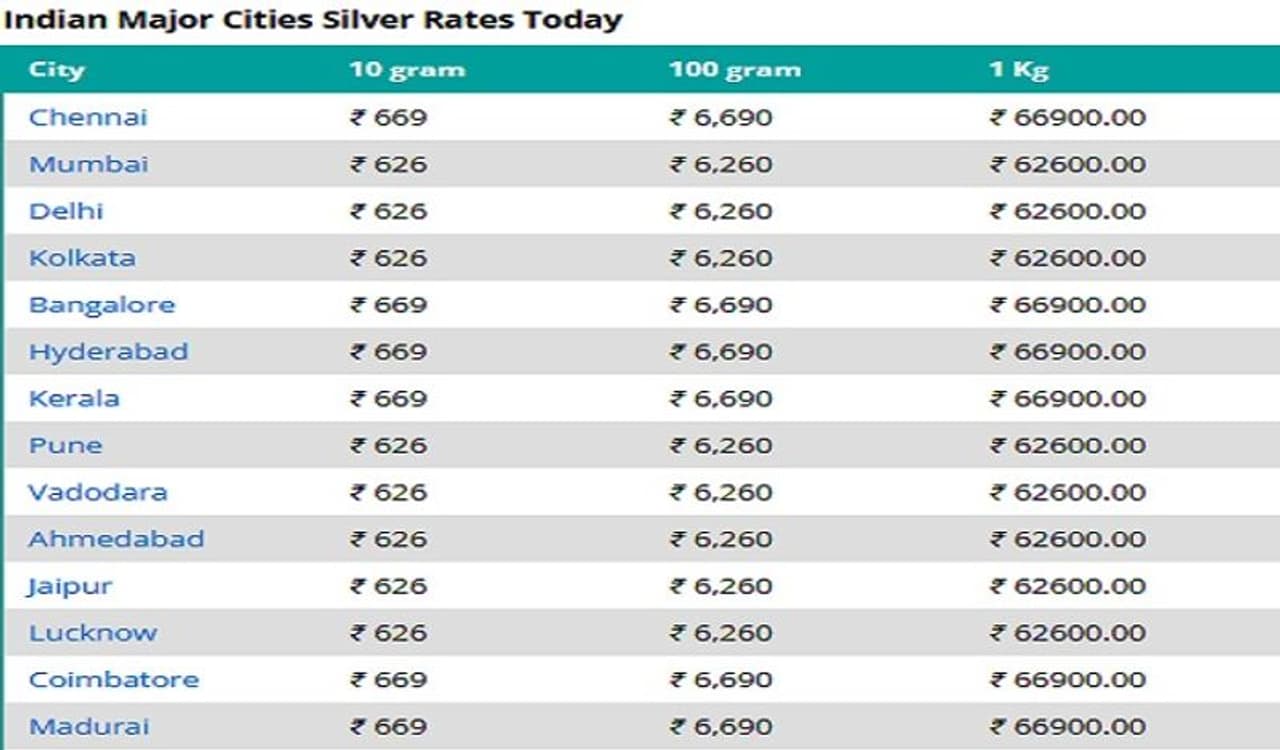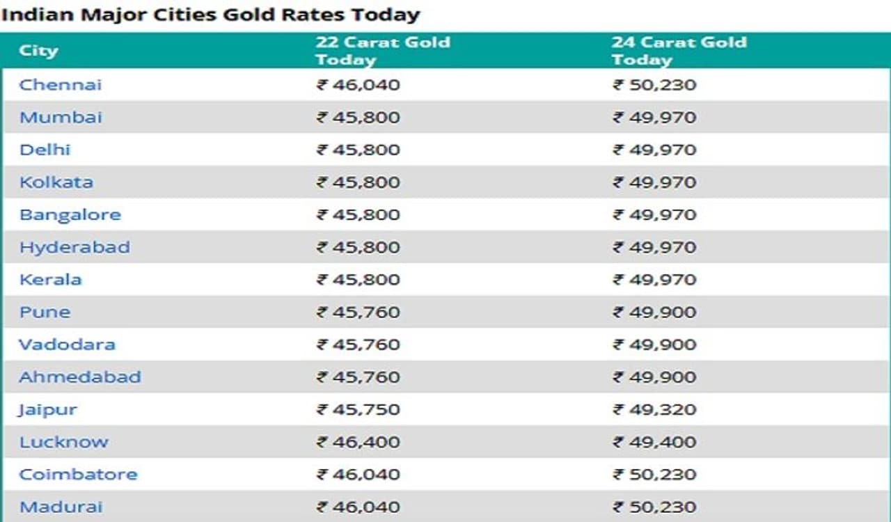 गुडरिटर्न्स वेबसाइट के मुताबिक, दिल्ली और मुंबई में 24 कैरेट सोना 49,970 रुपये पर बिक रहा है। दोनों शहरों में 22 कैरेट की कीमत 45,800 रुपये है। कोलकाता और चेन्नई में 24 कैरेट सोना 49,970 रुपये और 50,230 रुपये पर बिक रहा है। 22 कैरेट की कीमत चेन्नई में 46,040 रुपये और कोलकाता में 45,800 रुपये है। उत्पाद शुल्क, राज्य करों और मेकिंग चार्ज के कारण देश भर में सोने और चांदी की कीमतें बदलती रहती हैं। चेन्नई में 1 किलो चांदी की कीमत 66,900 रुपये है. दिल्ली और मुंबई में कीमत 62,600 रुपये है। कोलकाता में चांदी 62,600 रुपये प्रति किलो बिक रही है।
