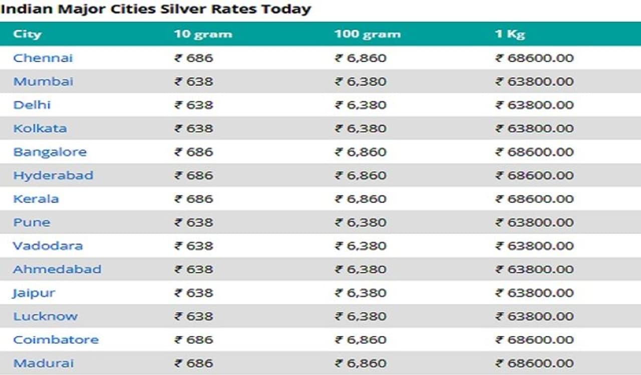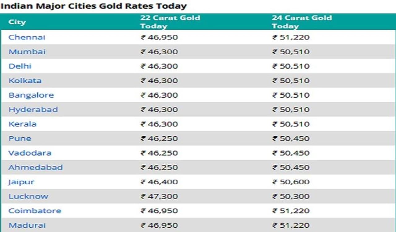 गुडरिटर्न्स वेबसाइट के मुताबिक दिल्ली, कोलकाता और मुंबई में 24 कैरेट सोना 50,510 रुपये पर बिक रहा है. इन शहरों में 22 कैरेट की कीमत 46,300 रुपये है। चेन्नई में 24 कैरेट सोना 51,220 रुपये पर बिक रहा है. चेन्नई में 22 कैरेट की कीमत 46,950 रुपये है। उत्पाद शुल्क, राज्य करों और मेकिंग चार्ज के कारण देश भर में सोने और चांदी की कीमतें बदलती रहती हैं। चेन्नई में 1 किलो चांदी की कीमत 68,600 रुपये है. दिल्ली, कोलकाता और मुंबई में कीमत 63,800 रुपये है।