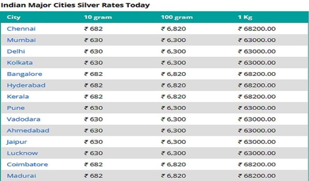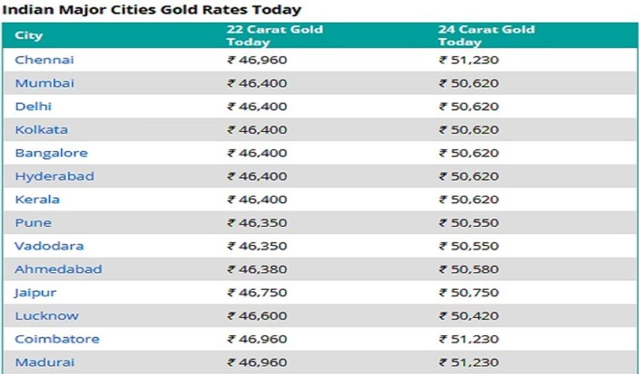 गुडरिटर्न्स वेबसाइट के मुताबिक दिल्ली, कोलकाता और मुंबई में 24 कैरेट सोना 50,620 रुपये पर बिक रहा है. इन शहरों में 22 कैरेट सोने की कीमत 46,400 रुपये है। चेन्नई में 24 कैरेट सोना 51,230 रुपये पर बिक रहा है. चेन्नई में 22 कैरेट सोने की कीमत 46,960 रुपये है। उत्पाद शुल्क, राज्य करों और मेकिंग चार्ज के कारण देश भर में सोने और चांदी की कीमतें बदलती रहती हैं। चेन्नई में 1 किलो चांदी की कीमत 68,200 रुपये है. दिल्ली, कोलकाता और मुंबई में कीमत 63,000 रुपये है।