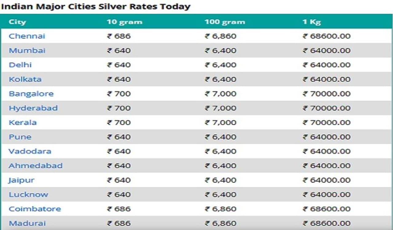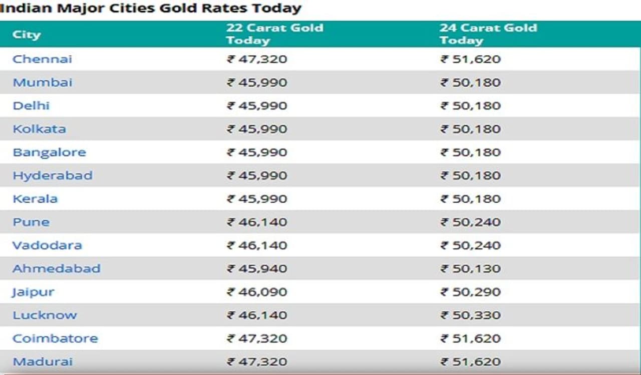 गुडरिटर्न्स वेबसाइट के मुताबिक, दिल्ली, कोलकाता और मुंबई में 24 कैरेट सोना 50,180 रुपए पर बिक रहा है. इन शहरों में 22 कैरेट सोने की कीमत 45,990 रुपए है। चेन्नई में 24 कैरेट सोना 51,620 रुपए पर बिक रहा है. चेन्नई में 22 कैरेट सोने की कीमत 47,320 रुपए है। उत्पाद शुल्क, राज्य करों और मेकिंग चार्ज के कारण देश भर में सोने और चांदी की कीमतें बदलती रहती हैं। चेन्नई में 1 किलो चांदी की कीमत 68,600 रुपए है। दिल्ली, कोलकाता और मुंबई में कीमत 64,000 रुपए है।