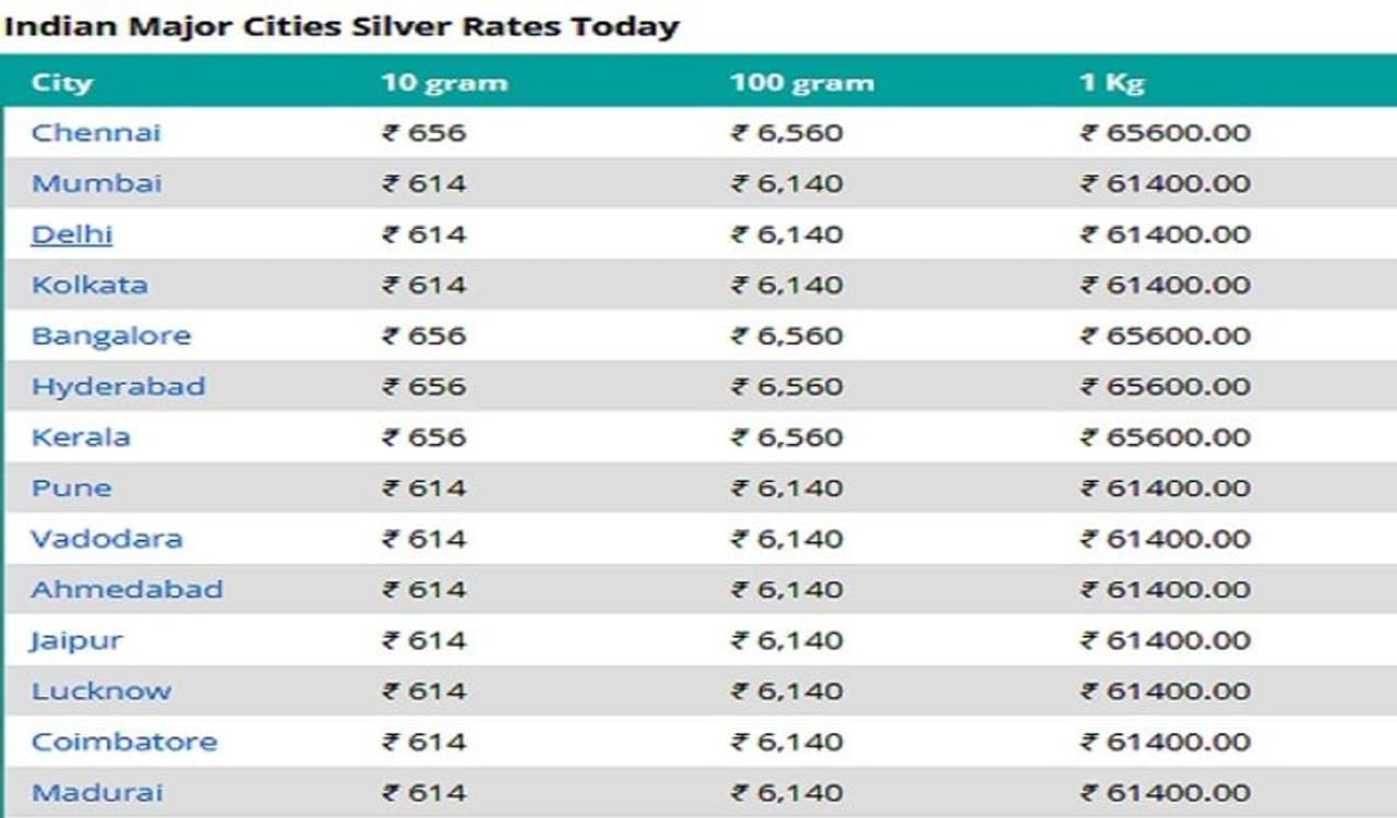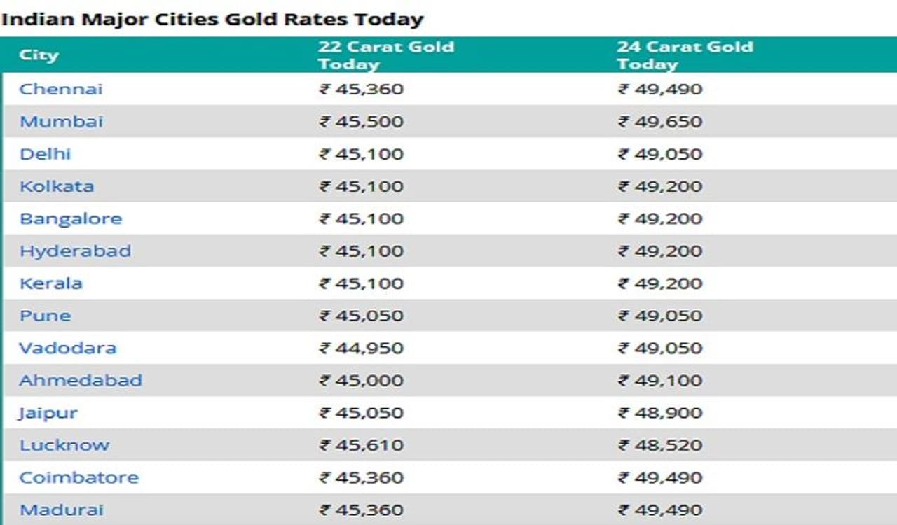 गुडरिटर्न्स वेबसाइट के मुताबिक, दिल्ली और मुंबई में 24 कैरेट सोने की कीमत क्रमश: 49,050 रुपये और 49,650 रुपये है। दिल्ली और मुंबई में 10 ग्राम 22 कैरेट सोने की कीमत क्रमश: 45,100 रुपये और 45,500 रुपये है। चेन्नई में 10 ग्राम 24 कैरेट सोना शुक्रवार को 49,490 रुपये पर बिक रहा है, जबकि 10 ग्राम 22 कैरेट सोना 45,360 रुपये पर बिक रहा है। उत्पाद शुल्क, राज्य करों और मेकिंग चार्ज के कारण देश भर में सोने की कीमत अलग-अलग होती है। चेन्नई में 1 किलो चांदी की कीमत 65,600 रुपये है, जबकि दिल्ली और मुंबई में यह धातु 61,400 रुपये पर बिक रही है। कोलकाता में चांदी 61,400 रुपये प्रति किलोग्राम पर बिक रही है, जबकि हैदराबाद और बेंगलुरु में धातु 65,600 रुपये प्रति किलोग्राम पर बिक रही है।