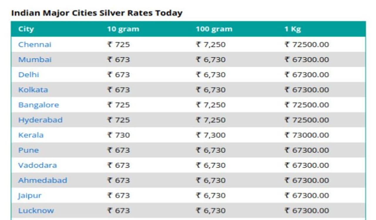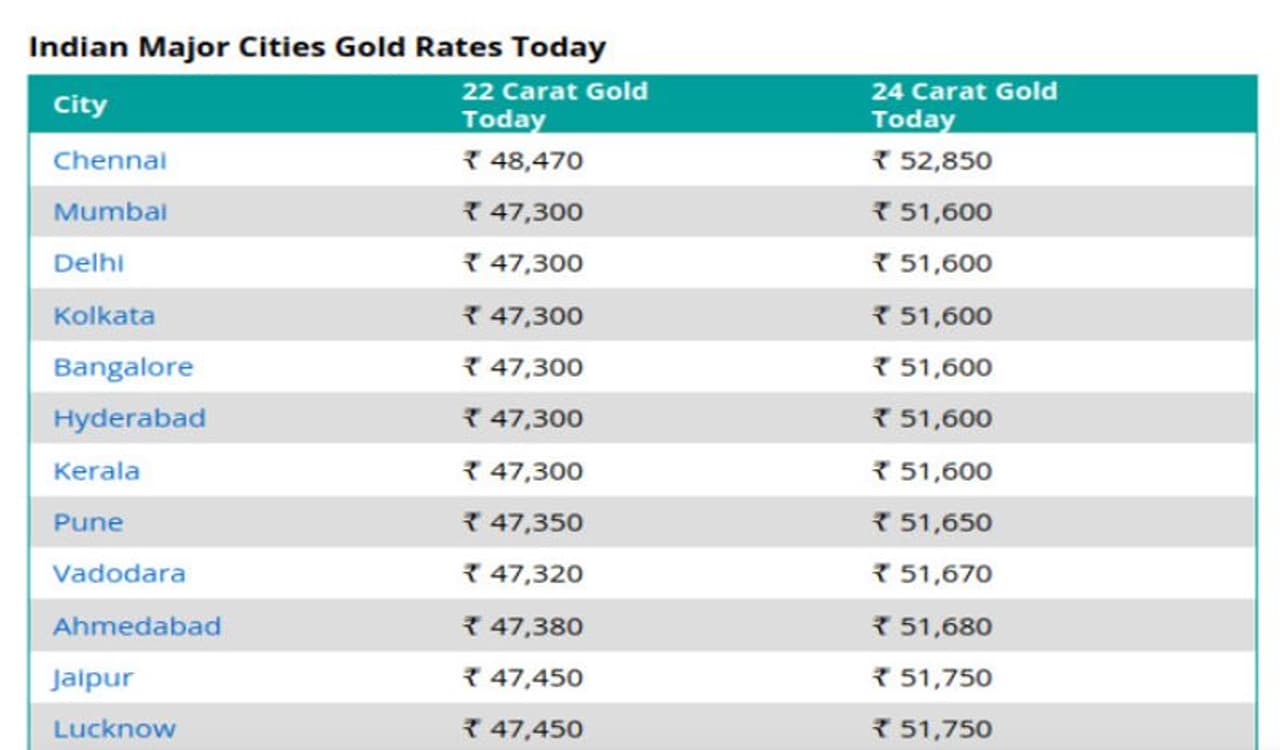 गुडरिटन्र्स वेबसाइट के मुताबिक दिल्ली, कोलकाता और मुंबई में 24 कैरेट सोना 51,600 रुपए पर बिक रहा है. इन शहरों में 22 कैरेट सोने की कीमत 47,300 रुपए है। चेन्नई में 24 कैरेट सोना 52,850 रुपए पर बिक रहा है. चेन्नई में 22 कैरेट सोने की कीमत 48,470 रुपए है। उत्पाद शुल्क, राज्य कर और मेकिंग चार्ज के कारण देश भर में सोने और चांदी की कीमतें बदलती रहती हैं। चेन्नई में 1 किलो चांदी की कीमत 72,500 रुपए है. दिल्ली, कोलकाता और मुंबई में कीमत 67,300 रुपए है।