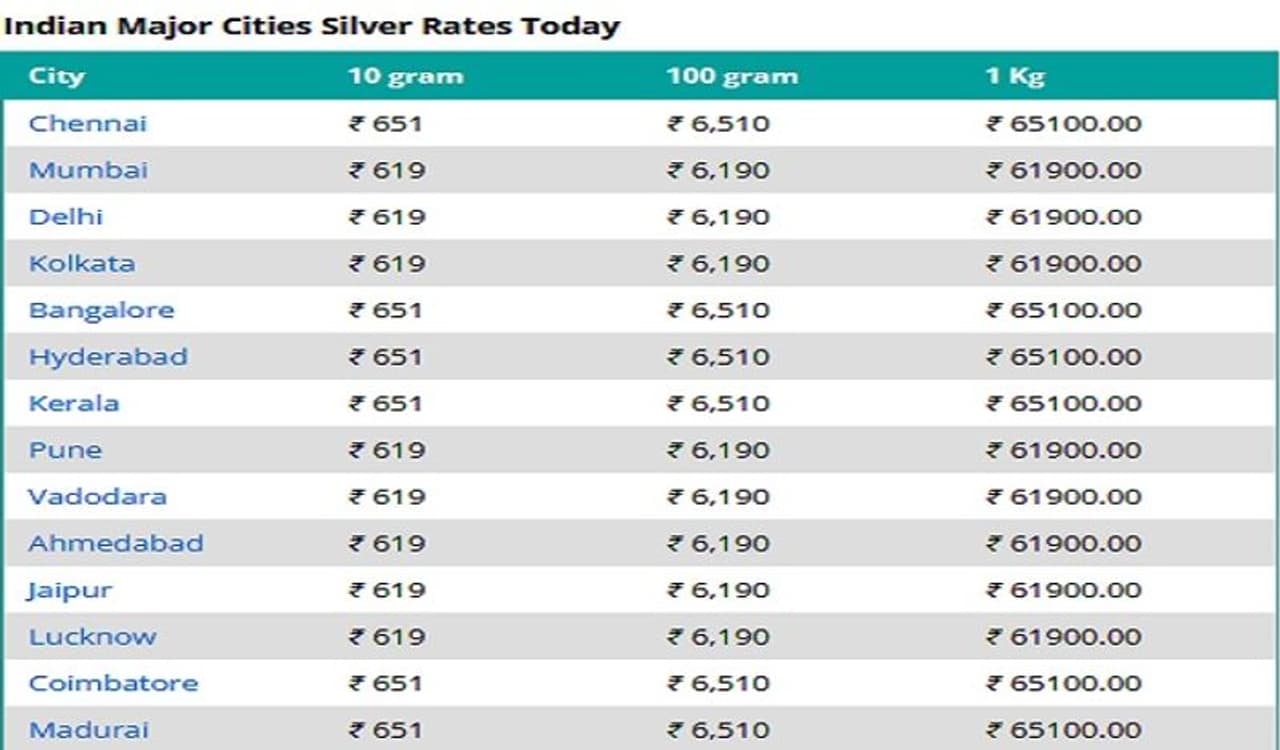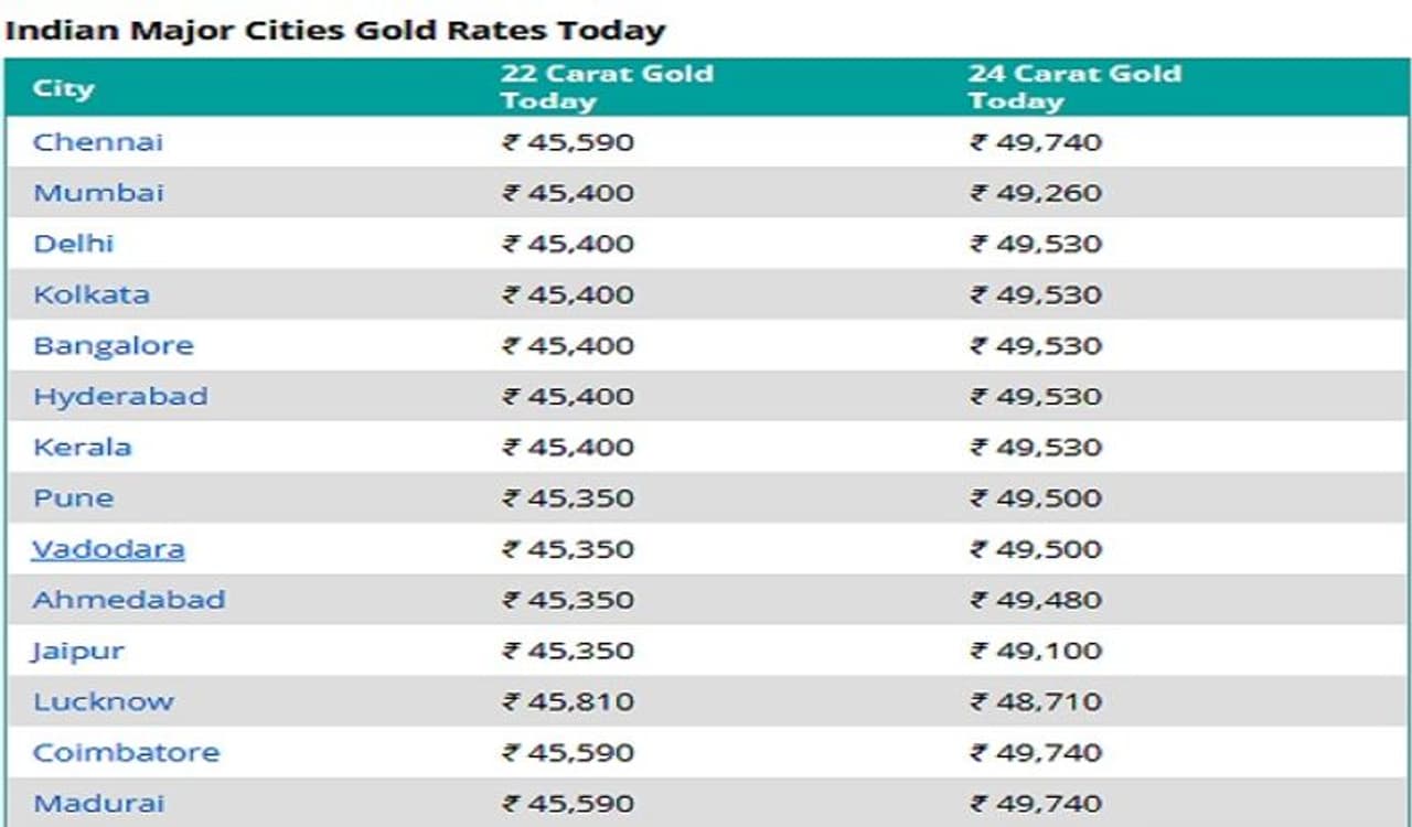 गुडरिटर्न्स वेबसाइट के मुताबिक, दिल्ली और मुंबई में 24 कैरेट सोने की कीमत क्रमश: 49,300 रुपये है। दिल्ली और मुंबई में 10 ग्राम 22 कैरेट सोने की कीमत क्रमश: 45,200 रुपये है। चेन्नई में 10 ग्राम 24 कैरेट सोना मंगलवार को 49,520 रुपये पर बिक रहा है, जबकि 10 ग्राम 22 कैरेट सोना 45,390 रुपये पर बिक रहा है। उत्पाद शुल्क, राज्य करों और मेकिंग चार्ज के कारण देश भर में सोने की कीमत अलग-अलग होती है। चेन्नई में 1 किलो चांदी की कीमत 64,900 रुपये है, जबकि दिल्ली और मुंबई में यह धातु 61,600 रुपये में बिक रही है। कोलकाता में चांदी 61,600 रुपये प्रति किलोग्राम पर बिक रही है, जबकि हैदराबाद और बेंगलुरु में यह धातु 64,900 रुपये प्रति किलोग्राम पर बिक रही है।
